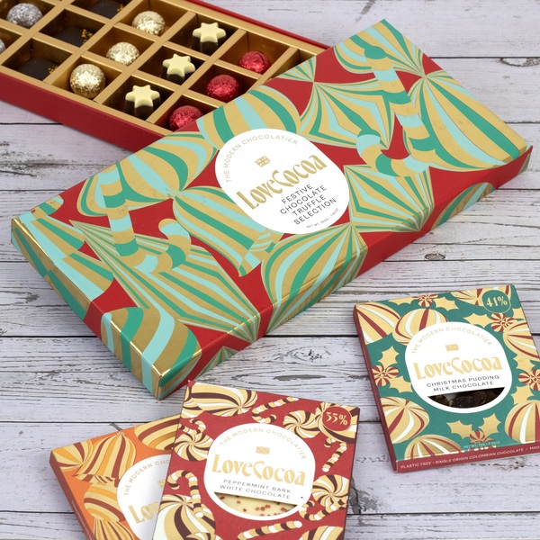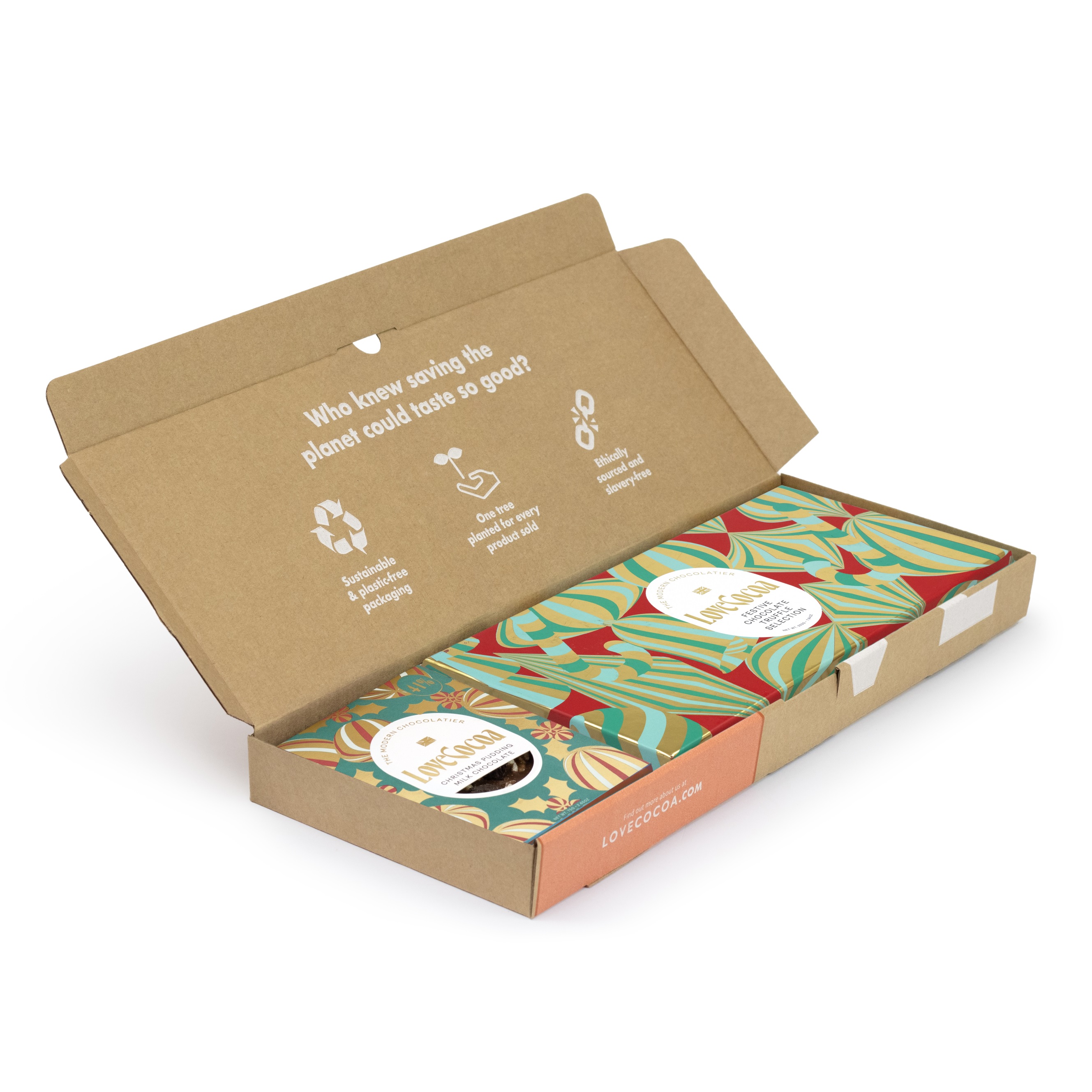 Perfect for treating those that are far away, this delightful box is letterbox friendly! Starring Love Cocoa's new Festive Selection Box, as well as Christmas Pudding Bar, Candy Cane Peppermint White Chocolate Bar and its Festive Gingerbread Dark Chocolate Bar, this looks and tastes the part. Merry Christmas! 100% plastic free packaging.