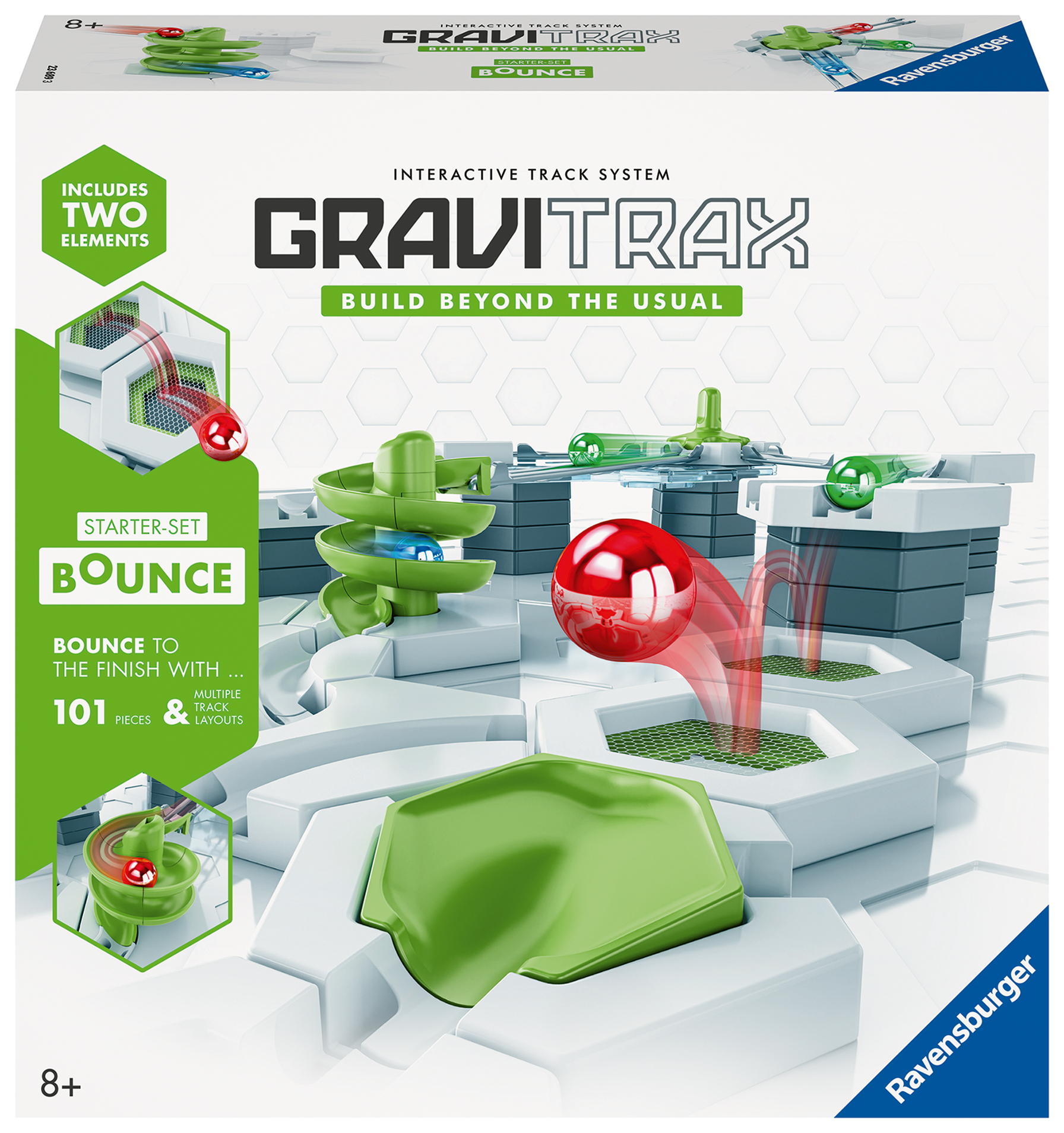 Unlock the infinite possibilities of the GraviTrax Universe with the GraviTrax Starter-Set Bounce. With this unique and interactive track-building system, create and experience marble run action like never before! The GraviTrax Starter-Set Bounce includes 101 pieces and features two action Elements to add wow-factor to your tracks: Send your marble round and round the bend with the Spiral Element and bounce your way to the finish with with 2-part Trampoline Element. Take inspiration from the included track layout plans or simply let your imagination go wild as you add in twists, turns and trickshots to send your marble racing around your tracks. GraviTrax Starter-Set Bounce is compatible with all other GraviTrax sets and accessories, so you can grow and expand your GraviTrax world however you choose. GraviTrax Starter Set Bounce is suitable from age 8 years and up.