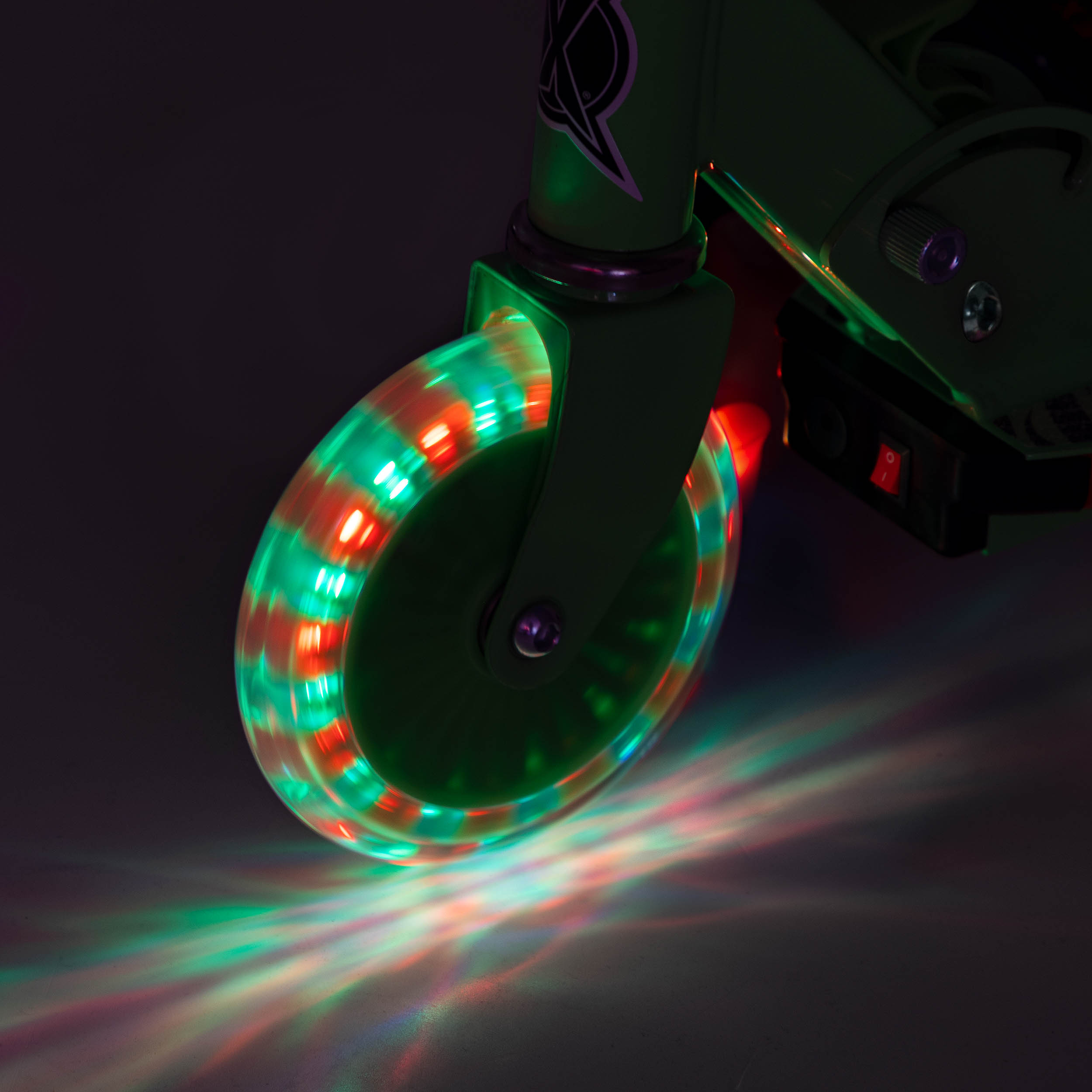 Kids will be the envy of the playground with the Xootz Wild Rider Scooter. With a striking leopard print design and bold colour scheme, the Wild Rider features a fun aluminium LED deck and 122mm LED wheels lighting up their path as the ride. The easy fold system allows for easy portability and the fully printed grip tape and comfortable TPR handle grips add stability without compromising on fun. Complete with adjustable height handlebars, the Wild Rider grows with your child meaning years of light up fun.