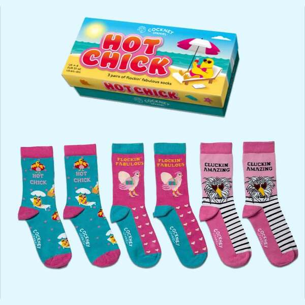 Step into a world of sock-tastic sassiness with our Hot Chick Ladies Socks - a triple threat of fabulousness for your feet! Unleash your inner glamour with three calf-length pairs that boast slogans like "hot chick"," "flockin fabulous", and "cluckin amazing". This pun-tastic trio aren't just socks; they're your secret weapon for turning every step into a strut. Crafted from a delightfully soft and breathable cotton-rich blend, these socks are as cozy as they are chic. Flaunt your flair with every fashionable footfall. The Hot Chick Ladies Socks are sure to ruffle some feathers. Fits UK Women's size 4-8. These socks are made of: 67% Cotton, 25% Polyamide, 7% Polyester, 1% Elastane.