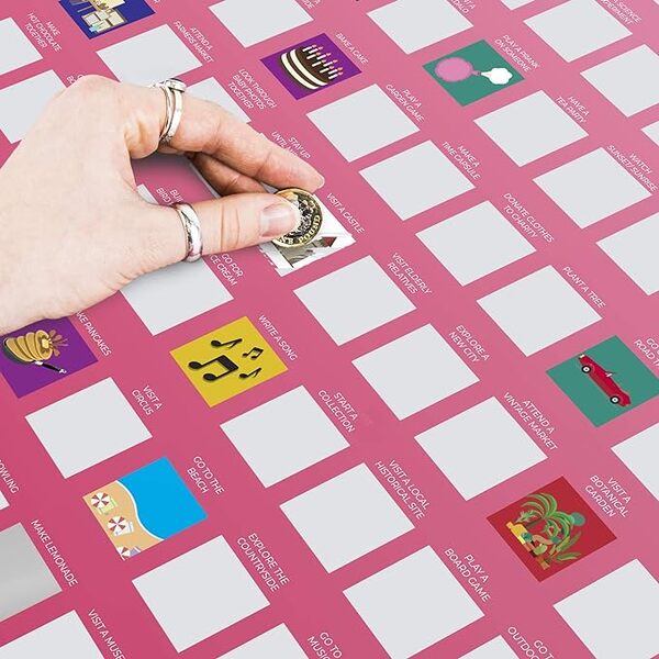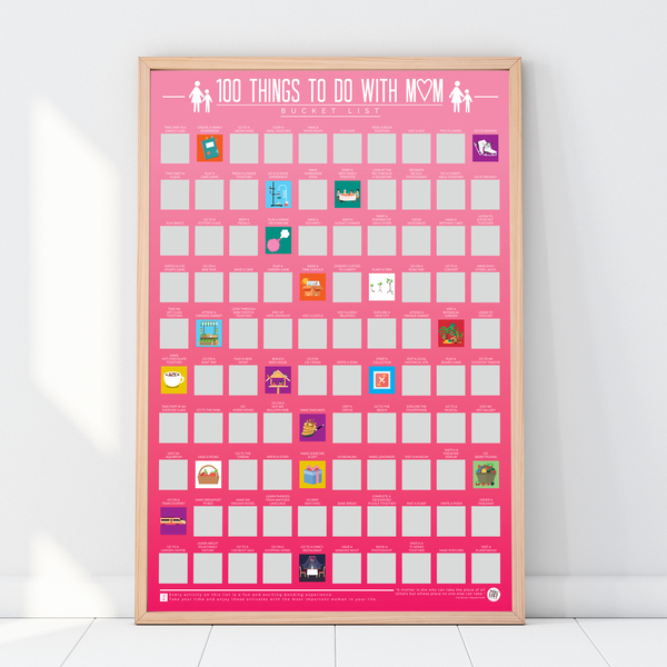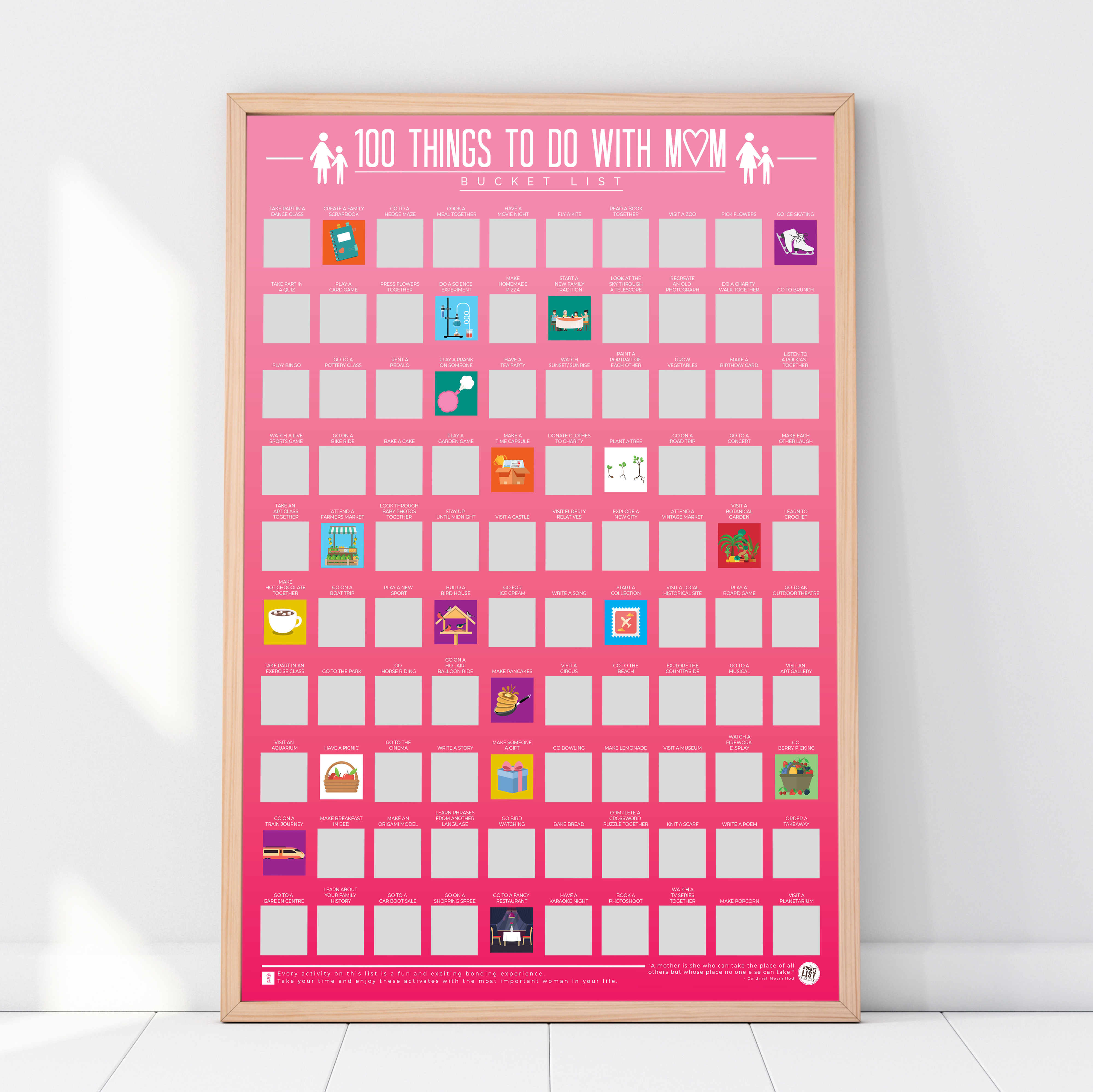 Our 100 Things To Do With Mum scratch poster boasts a treasure trove of 100 delightful activities; the perfect recipe for unforgettable moments with the queen of your heart. Dive into a world of creativity and sweetness as you whip up whimsical cakes together or immerse yourselves in the art of crafting scrapbook masterpieces. This poster isn't just a list; it's a magic carpet ride of bonding brilliance, ensuring that each scratch reveals a new and exciting escapade to share with your most cherished lady. Get ready to paint your days with laughter, sprinkle in a dash of love, and embark on a journey where the joy lies in the shared experience, making every day with Mum an extraordinary adventure!