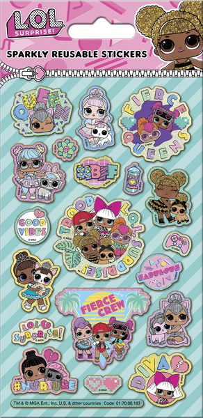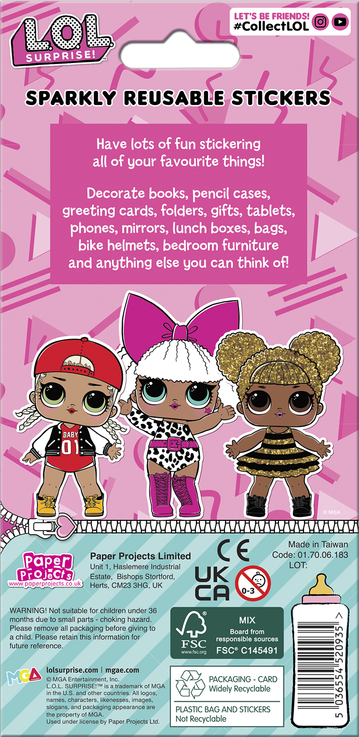One sheet of reusable foiled stickers featuring L.O.L. Surprise! Dolls packaged with an illustrated backing board. Perfect for decorating books, folders, laptops, pencil cases, bikes, cards, and anything else you can think of! High quality stickers with holographic effect foiling Stickers are reusable and do not tear on removal from surfaces Fun for decoration and creative play