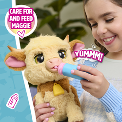 Get ready for farm pet fun, maximum giggles and furReal Maggie the Feed & Follow Cow. This a-MOO-zing mini pet comes from the Scottish Highlands, and features over 50 different combinations of sound-and motion reactions. Sized 33cm tall, this animated plushie is always up for a snack and a walk. Slide the switch on her belly to on and begin play. Pet her head forward to smooth her floofy tuft of hair and hear a variety of cute moos, laughter, and other udderly amusing mini cow sounds. Pat Maggies head to activate blinks of her cute brown and green eyes. Press the button on her back to activate walking motions and wags of her fuzzy tail. Next, its time for a snack! Put her bottle in her mouth, give it a twist, and guide Maggie as she walks. Listen to adorable cowbell, slurp, and sip sounds. This adorable animated plush kids toy makes a fine-bovine surprise for animal lovers ages 4 years and up.