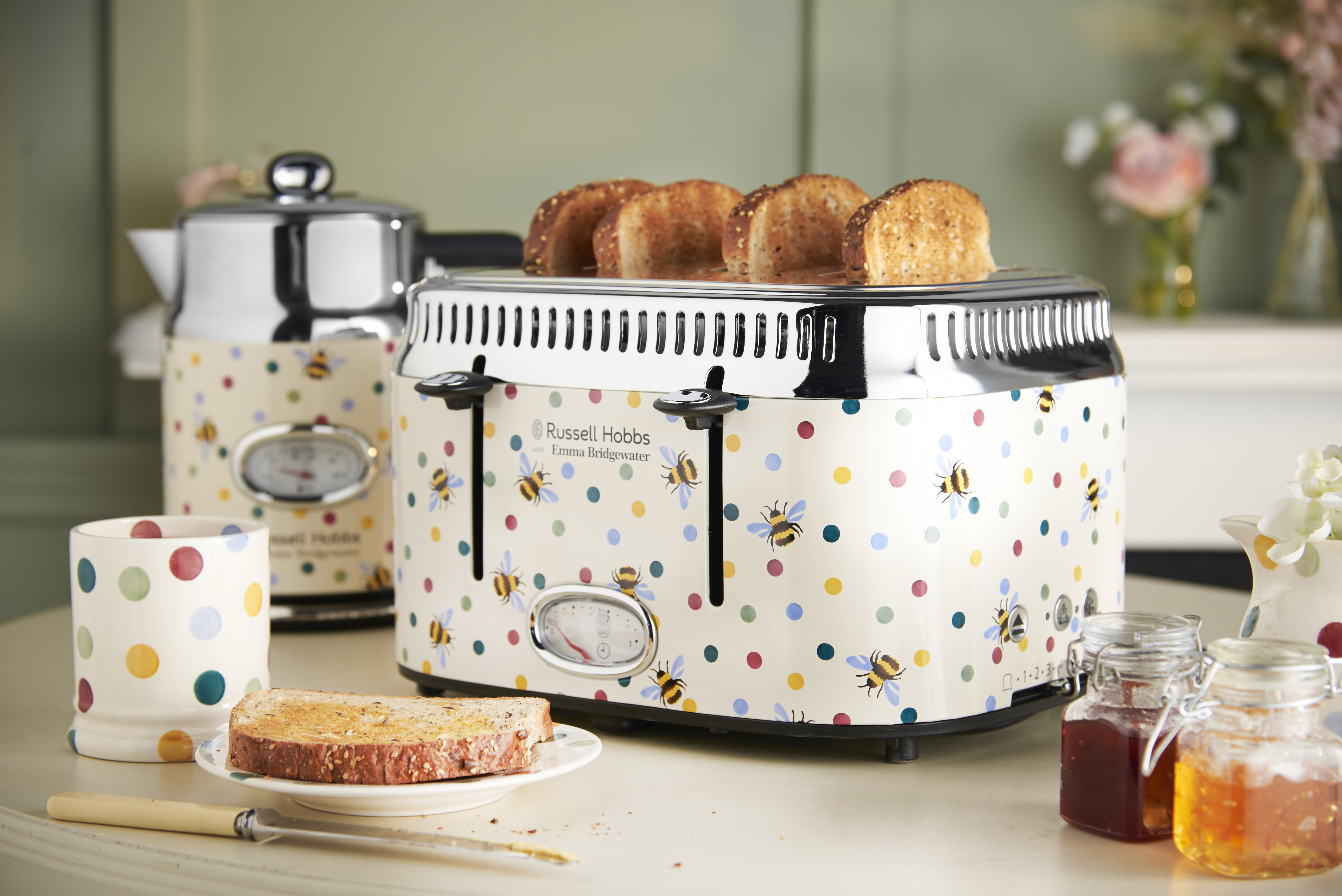 The delightful Bumblebee and Polka Dot 4 Slice Toaster combines the trusted performance and reliability of Russell Hobbs with a beautiful Emma Bridgewater design. It has all the features you’d expect including a toasting gauge, adjustable browning control and lift and look function, so you can enjoy your toast just the way you like it.