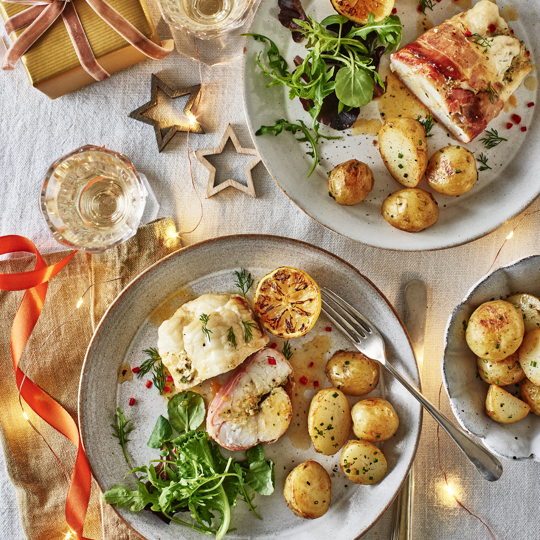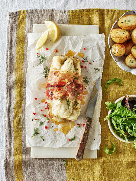 Responsibly-caught monkfish fillets rolled in dry-cured ham from Dingley Dell Farm, with a tarragon, lemon and chilli. Serves 2