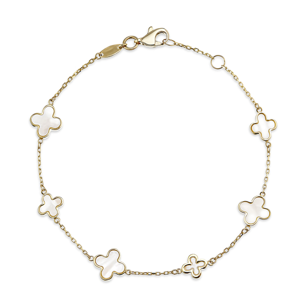 Crafted with delicate details and charming touches, this 9ct Yellow Gold Mother of Pearl Clover Bracelet will add a luxurious enhancement to every look.