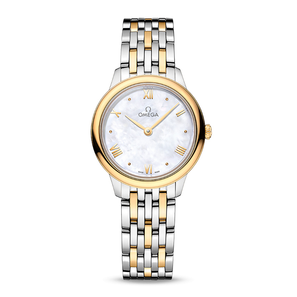 Let your understated glamourous style be a focal point for all with this beautiful OMEGA De Ville Prestige 27.5mm Stainless Steel and 18K Gold Ladies Watch. Dressed with a sumptuous bi-metal design and lustrous mother of pearl dial, this timepiece speaks sophistication and elegance.