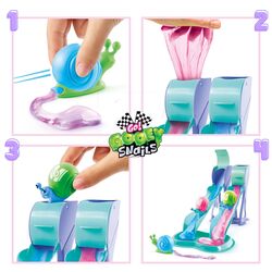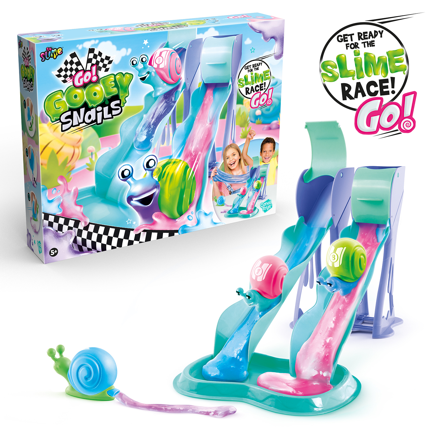 Let the race begin with the Go Gooey Slimy Race Set. Endless slime fun, add the slime to the slides, place the colourful snails and let them race against each other. Detach and squeeze the shell to suck in the slime sludge! Squeeze again to leave a slime trail! It makes funny slurping sounds. Includes 2 slides, 2 snails and 2 slimes for racing fun! So Funky, So Slime!