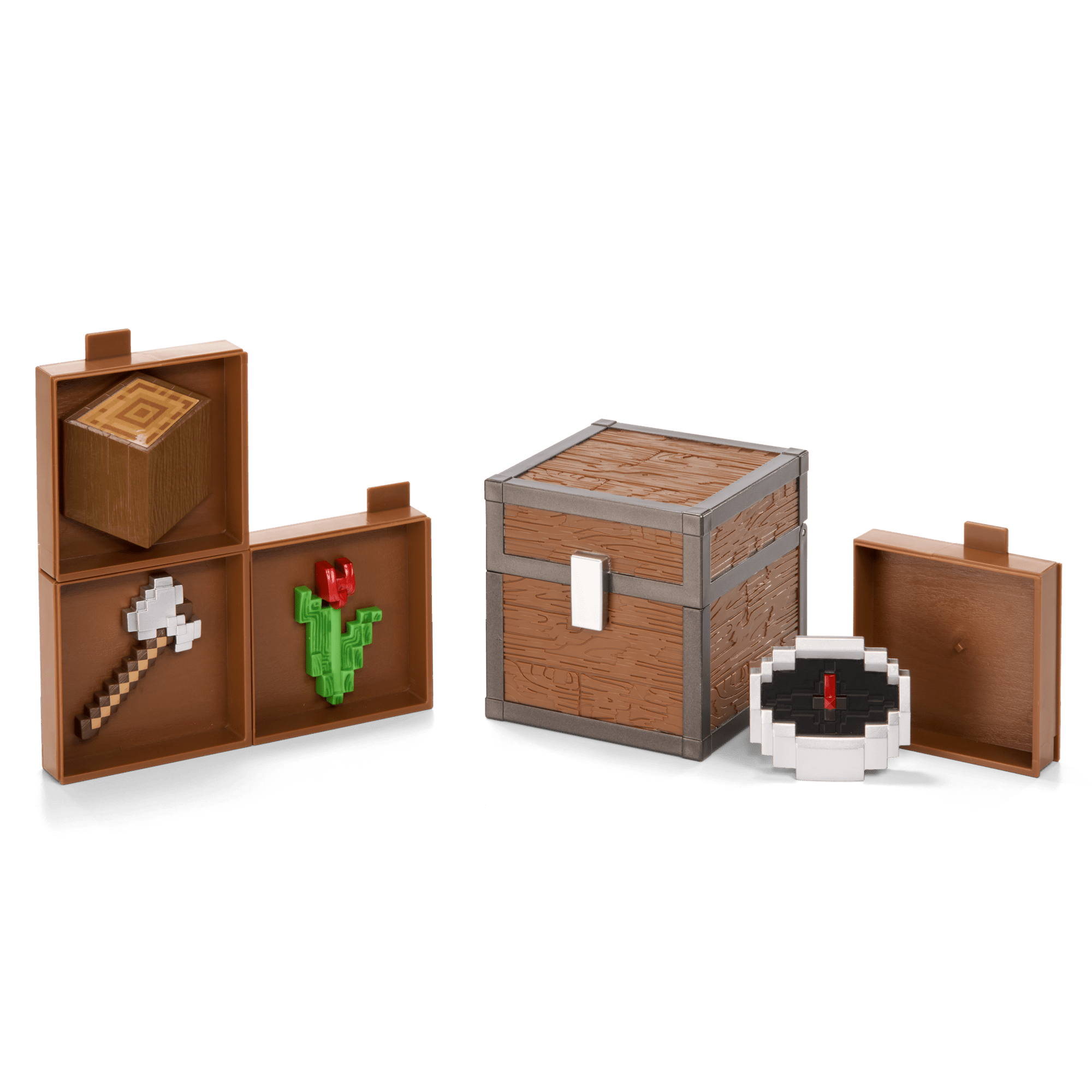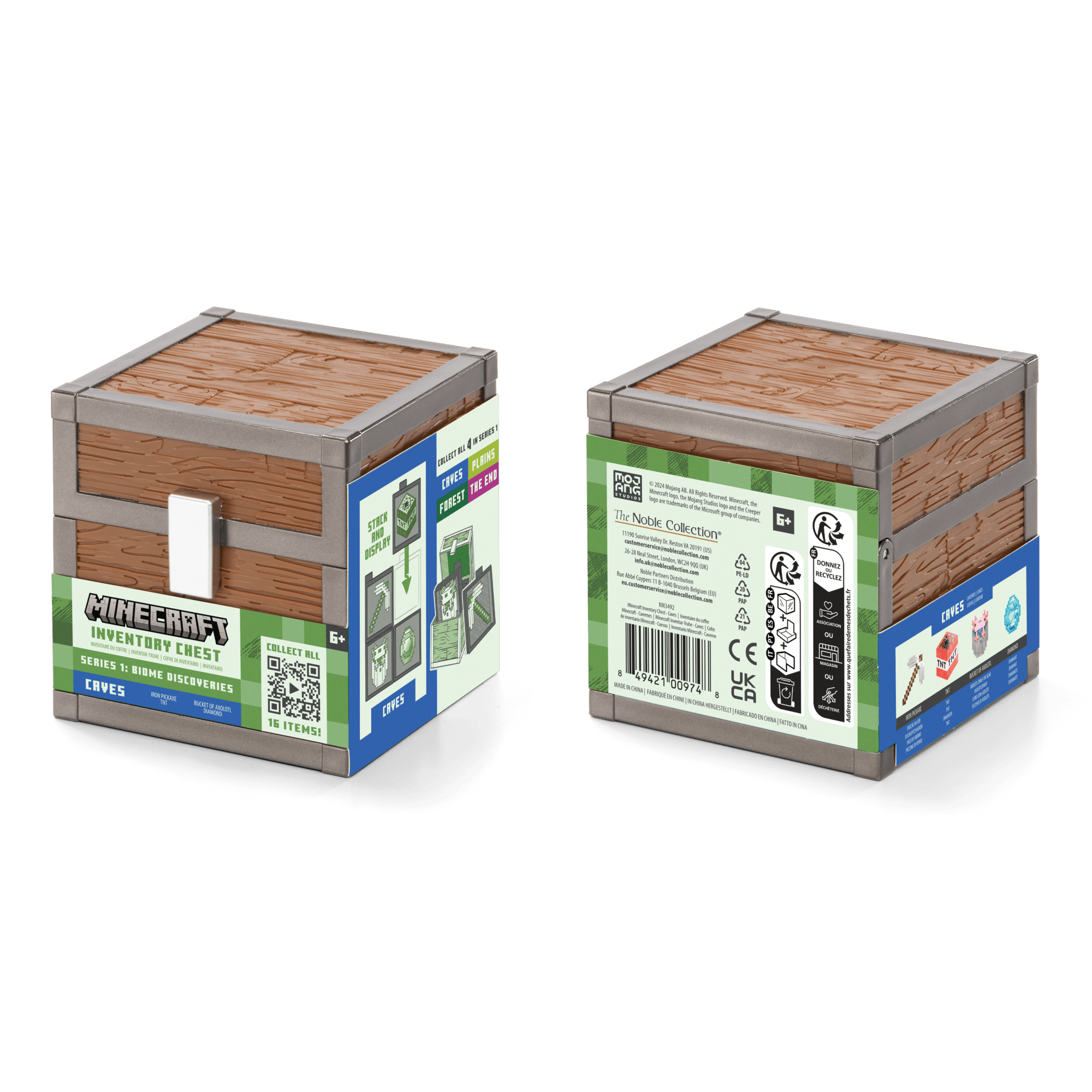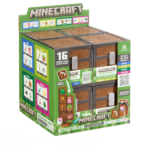 New from The Noble Collection's partnership with Mojang comes a selection of 4 Minecraft Inventory Chests, available individually or as a retail-friendly 8-piece CDU. Bring your digital inventory into the real world – each of these loot chests (sold separately) focuses on 4 items specific to 4 different in-game locations for a total of 16 unique items, including never before seen items like the Compass and Flower. Each chest includes: Caves: Iron Pickaxe, TNT, Bucket of Axolotl, Diamond Forest: Iron Axe, Oak Log, Compass, Red Tulip. Plains: Wooden Axe, Grass Block, Torch, Iron Ingot. The End: Diamond Sword, End Stone, Bottle of Dragon's Breath, Eye of Ender Ready to display your loot? Use the included inventory slots to build a showcase for your items, or display each item individually. Each chest measures approximately 4” tall, and items measure up to 3” tall. These inventory loot chests are the perfect collectible items for Minecraft fans aged 6+.