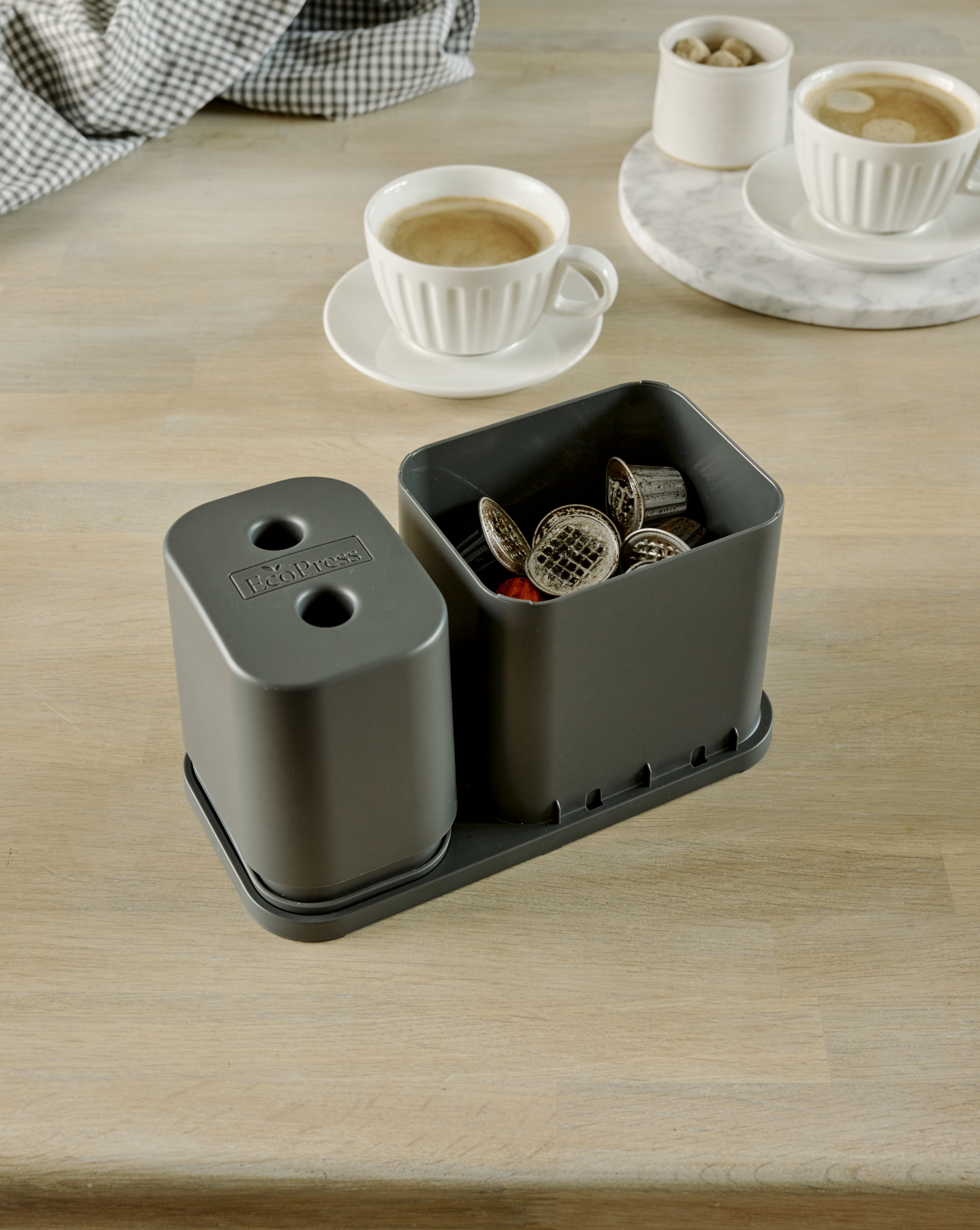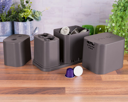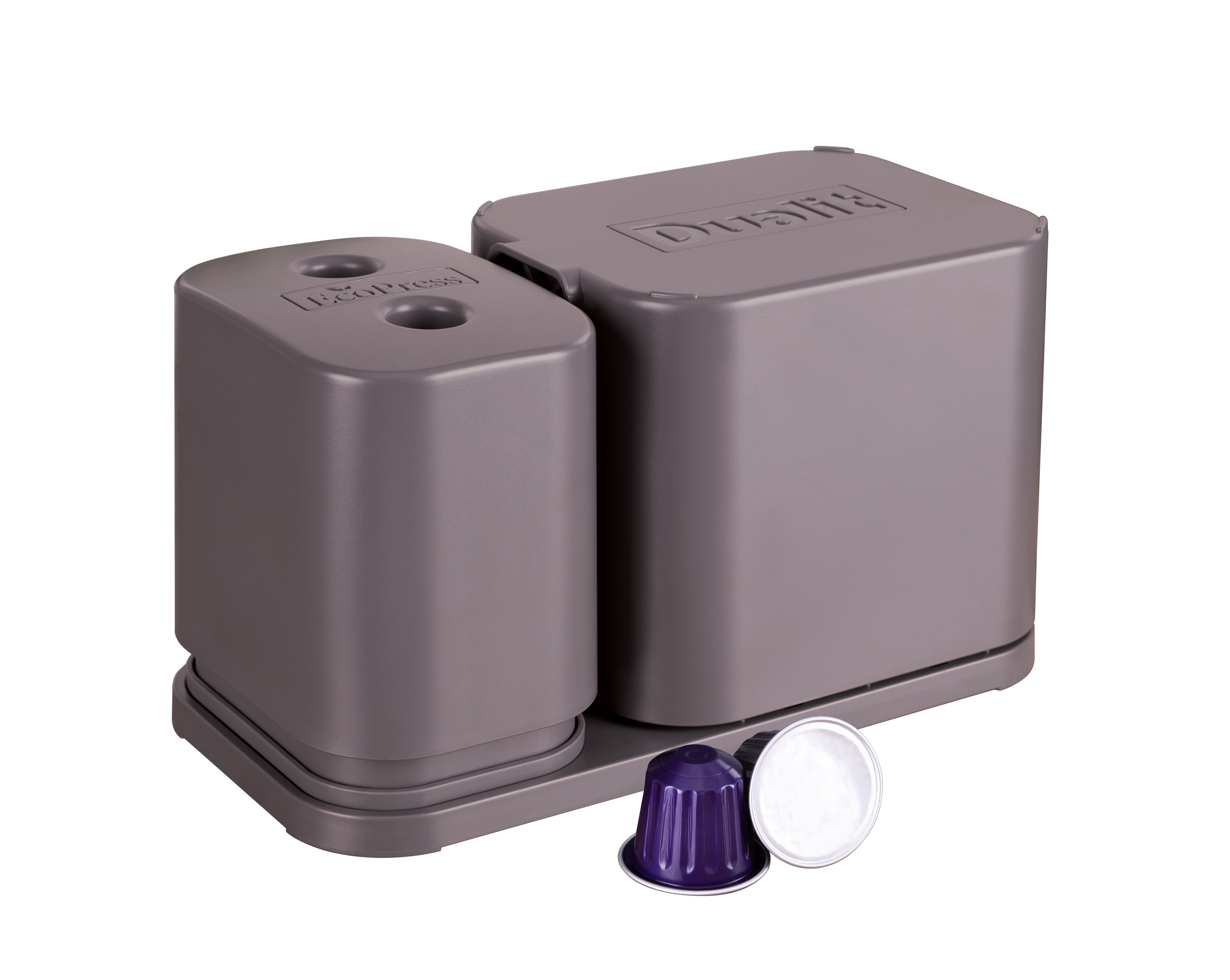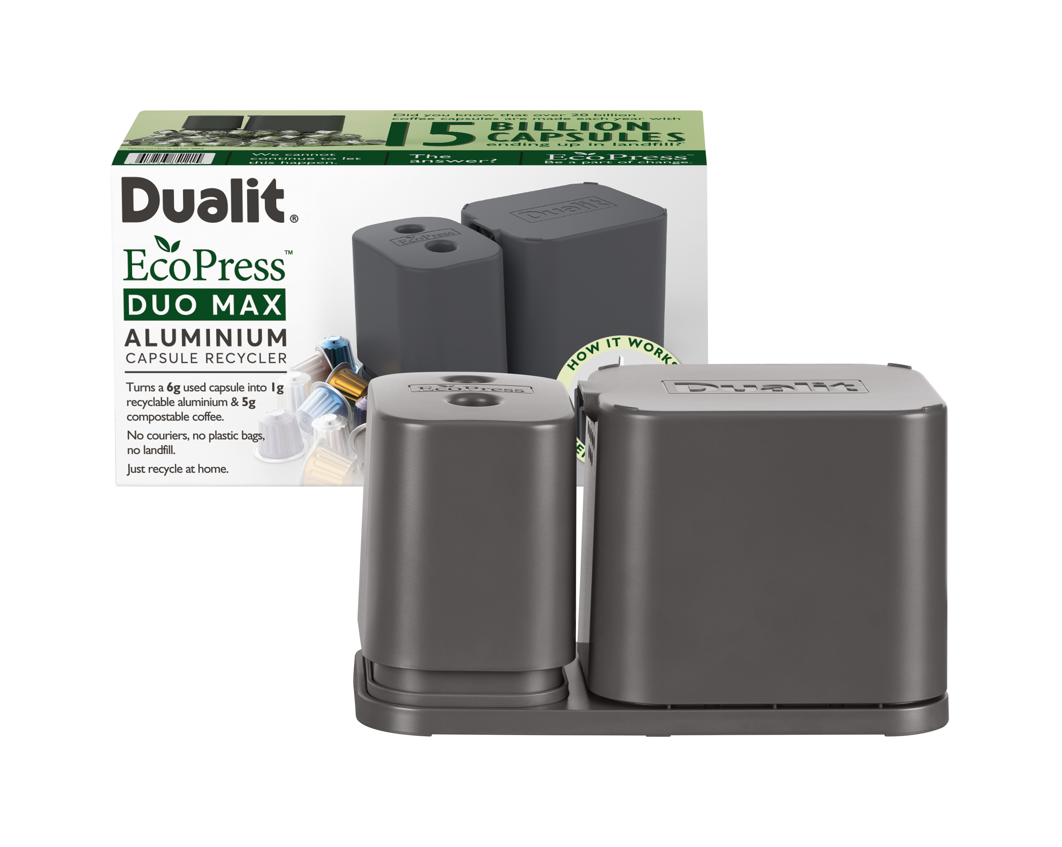 Dualit's EcoPress Duo Max helps make recycling used aluminium coffee pods at home fast and simple. Compatible with most brands of original aluminium capsules*, the EcoPress Duo Max turns pods inside out, two at a time for extra speed, to remove coffee grounds. After a quick rinse, all that's left to do is stack your clean capsules and squash together, then add to your household recycling bin. The coffee grounds can then be composted. EcoPress Duo Max includes a space to store used capsules, and a rinsing container to remove any leftover grounds.