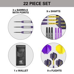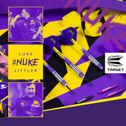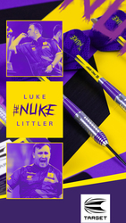 The Luke Littler Steel Tip Brass Darts Set, designed in collaboration with Luke “The Nuke” Littler, following his tremendous performance in the 2024 World Championship Finals. This comprehensive set includes three 60mm long Nuke brass barrels, with black 26mm steel tip points. The barrel design features a tapered nose, phasing into a straight barrel with radial groove cuts throughout for enhanced finger grip. Complete with 9 Pro Ultra No.2 shaped flights and 9 shafts in three diverse colours; purple, black, and yellow, ensuring ultimate customisation of your darts with the universal 2BA thread. Store your darts and accessories in the trifold wallet included in the set. Pack Contains: 3x Nuke Brass Barrels, 3x 26mm Steel Tip Points, 9x Pro Ultra Flights (3x Purple, 3x Black, 3x Yellow), 9x Pro Grip Shafts (3x Purple, 3x Black, 3x Yellow), 1x Target Trifold Wallet. Available weights: 22g (Diameter: 8.7mm).
