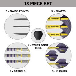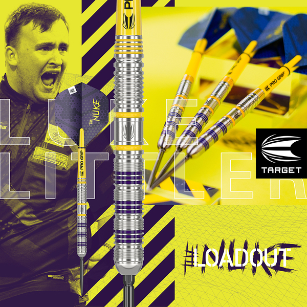 Introducing the Luke Littler Loadout Steel Tip Darts, a collaborative design with the 2024 PDC World Championship finalist. The dart set includes a 90% Tungsten straight barrel 52mm in length, featuring radial grooves for enhanced finger grip. Throughout the sleek design, you'll find small pops within the grooves of Nuke’s signature purple and yellow colours. The 26mm Black Swiss Point, utilizing Swiss Point Technology, allows for easy point switching, and its flush integration with the barrel adds to the set's sleek appearance. The set includes a Short Pro Grip Shaft for a seamless lead-in and a firm flight grip, minimizing fallouts. Completing the ensemble are the Nuke Pro Ultra No.2 Flights, created with a spot UV print for enhanced durability. This comprehensive dart set embodies precision, style, and durability, making it the ultimate choice for players seeking top-tier performance. The pack contains 3x 90% Tungsten Loadout barrels, 3x 26mm Swiss Points, 3x Short Pro Grip Shafts, 3x Pro Ultra No.2 Luke Littler flights, and 1x Swiss Point Tool. Available in 3 weight options: 22g (6.3mm dia), 23g (6.5mm dia), and 24g (6.6mm dia).