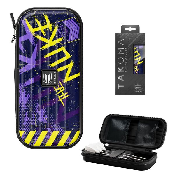 Introducing the Luke Littler Takoma Darts Wallet, a robust darts storage case, player-endorsed by Luke “The Nuke” Littler, following his remarkable performance at the PDC World Darts Championship 2024. The Takoma wallet is crafted from a strong and durable EVA material, this wallet securely holds three fully assembled darts in place with an elastic strap, preventing any movement during transport. The velvet-lined interior offers a soft and scratch-resistant environment, ensuring your darts remain in pristine condition. The Luke Littler Takoma Darts Wallet also features two zip-locked pouch pockets for spare accessories such as flights, shafts, points, or a Swiss Point tool, providing organized storage for all your dart essentials. Compact yet spacious, the Takoma Darts Wallet combines functionality with a touch of elegance, making it the perfect companion for both casual and competitive dart enthusiasts. Elevate your dart-carrying experience with this stylish and practical solution, adorned with Luke's formidable nickname, the "Nuke", this wallet captures the essence of his explosive prowess on the darts board. The fusion of purple and yellow mirrors the electrifying energy that defines Luke's game, reflecting the boldness and flair that make him a standout in the world of darts.