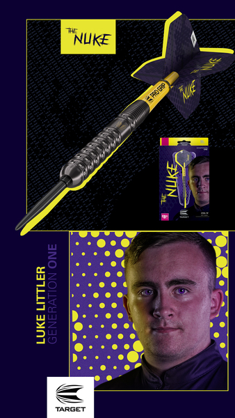 The Luke Littler Generation One, designed alongside ‘The Nuke’ to his exact specifications and requirements. The 90% Tungsten range offers a multi-grip barrel profile, consisting of Dual Pixel Tip at the front and centre of the barrel providing a high level of grip and then finally a fine radial groove grip at the rear of the barrel for a more subtle feel. The barrel is then overlaid with Black PVD Performance coating and further re-machined to highlight the Dual Pixel Tip technology. The Range is then completed with Target Pro Grip Shafts, ‘The Nuke’ Signature Flights, and Target Swiss Points.