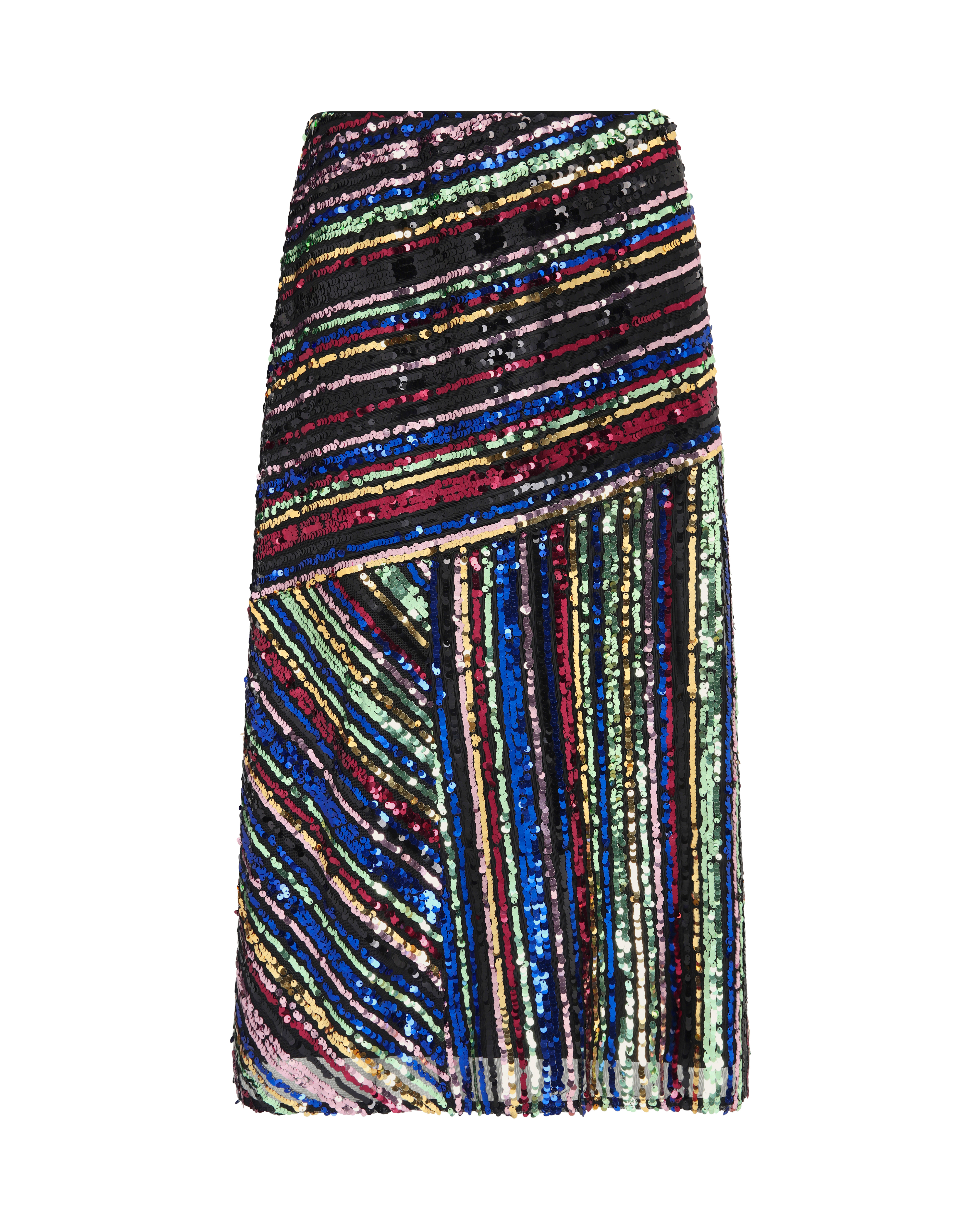 A a soft, luxurious black velvet skirt with colourful sequins. Available in petite and regular sizes.