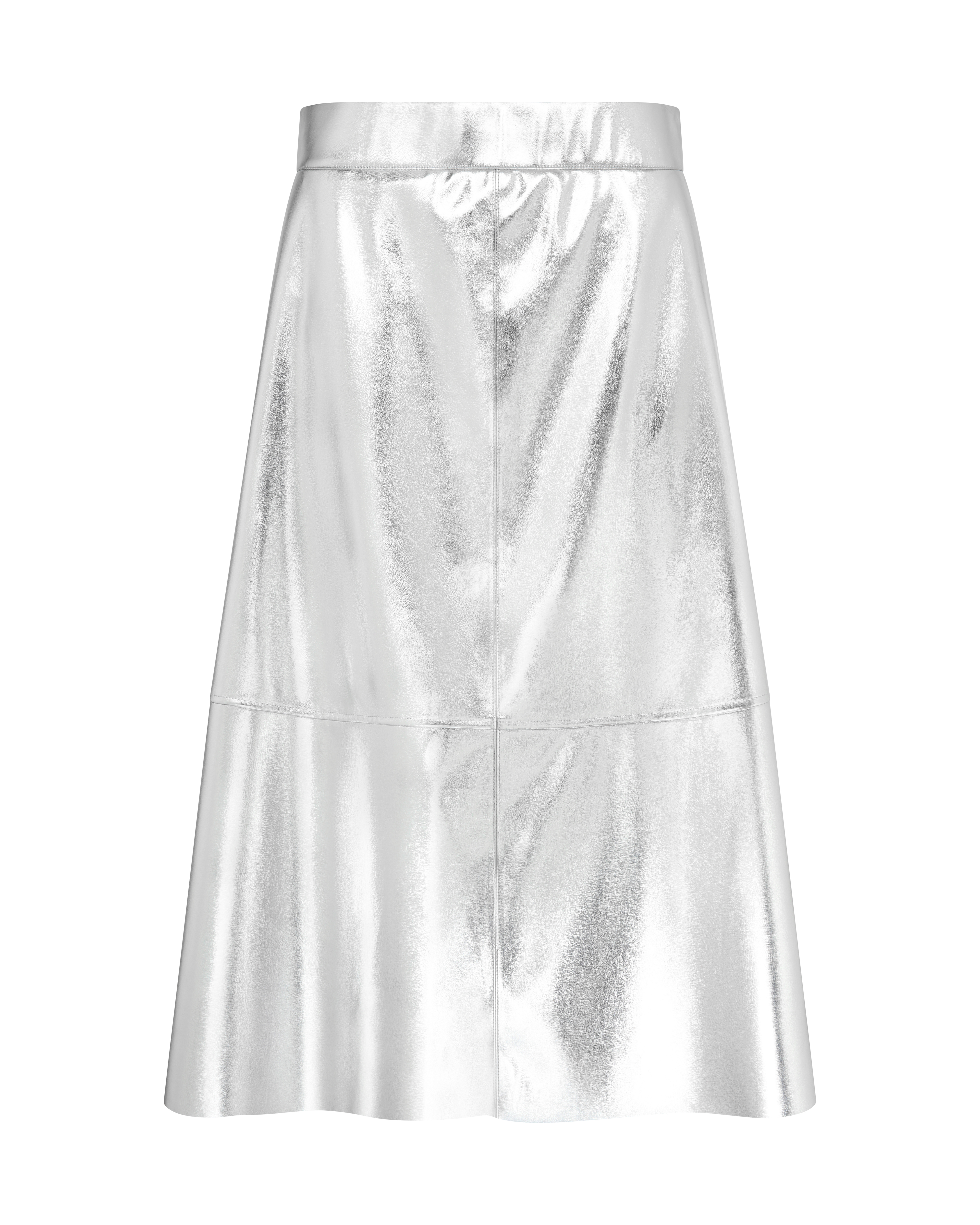 Apart of Danni Minogue's new and upcoming collection. A soft faux- leather, maxi silver A line skirt.