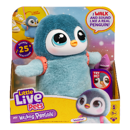 Little Live Pets My Walking Penguin Waddles moves and sounds just like a real penguin! Feed him with his feeding fish and give him a cuddle as he reacts to your touch. Watch his wings flap and his head bob as he walks! Waddles makes so many funny and sweet sounds - he feeds, giggles, sneezes and may even let out a cute fart too! With over 25 sounds and reactions, Waddles is super interactive and cute! Waddles has soft, fuzzy fur and wings that flap as he walks. Attach his leash to take him for a walk or watch as he moves and dances to his own music tunes.