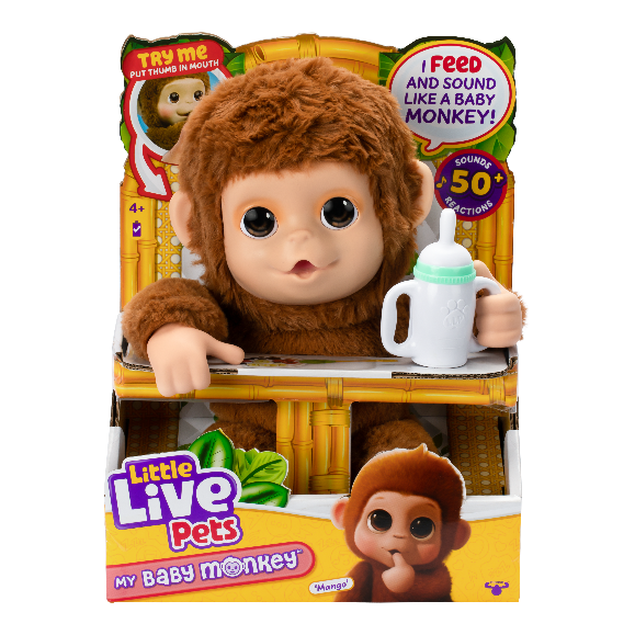 Little Live Pets My Baby Monkey Mango is the cutest, funnest baby anyone could have! Play with Mango and he responds with over 50 sounds and reactions, with adorable ears and super soft fur, just like a real baby monkey! Mango's mouth moves as he sucks his thumb and feeds from his bottle. This baby monkey loves to be cuddled and cared for, and reacts to your touch. You can even tickle him to hear him giggle! When Mango is tired, lay the sleepy monkey on his back to hear him hum a lullaby, or watch him snooze as he hangs upside down! With grippy hands and feet, Mango the Baby Monkey can grab and hang onto things like a real monkey! Sign his adoption certificate, promise to always look after him, and Mango will be your very best friend!