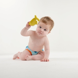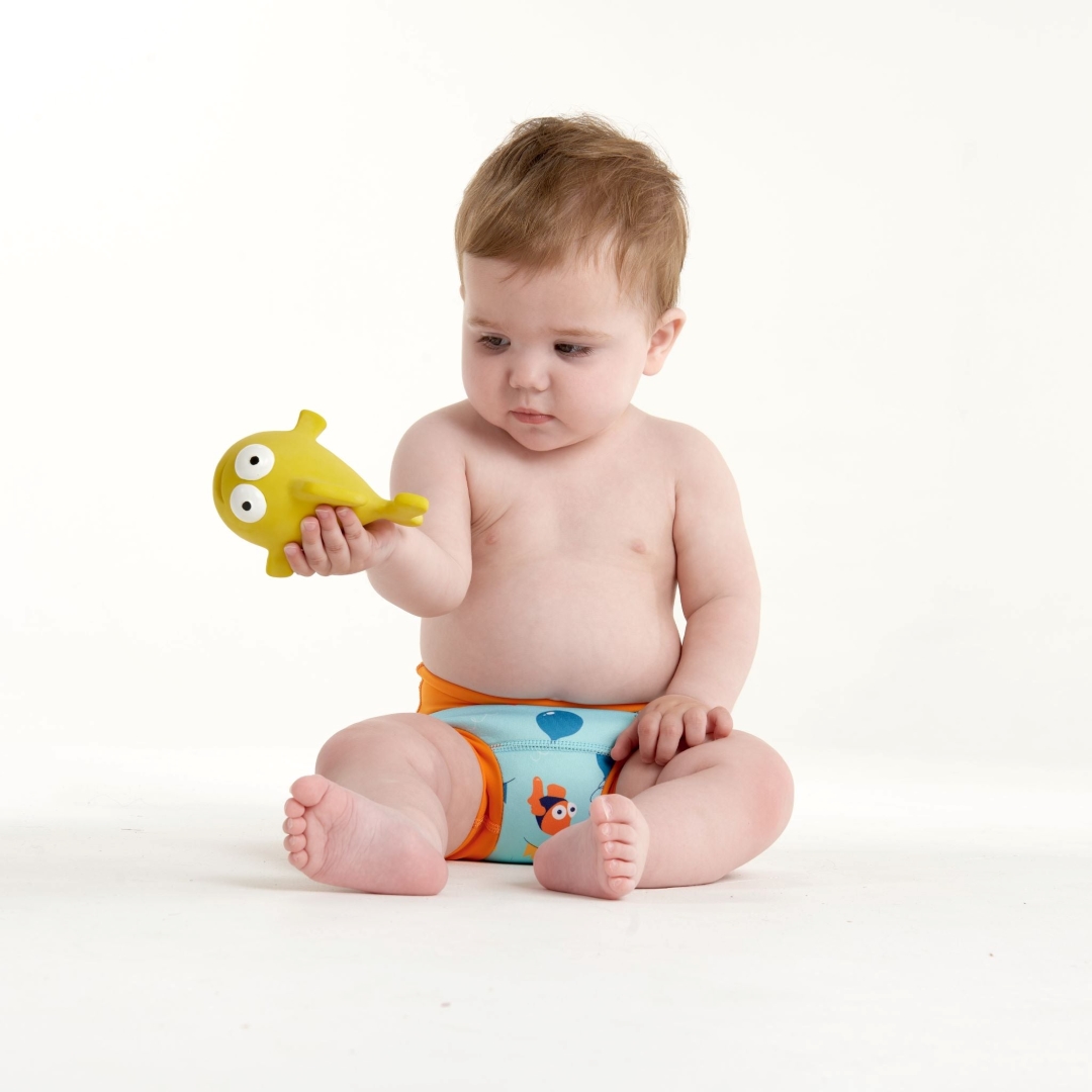 Our yellow fish toy, Custard, is part of the Water Babies Fish Family, along with Smooch, Inky, and Dotty; all of them designed and named by our Water Babies swimmers. Crafted from 100% natural latex rubber sourced from the Hevea tree, soft and squeezy, this bath toy is phthalate-free and brightly coloured using food-grade dyes, ensuring it is safe for babies to chew. It is hand-painted and has been rigorously tested for use from birth, which makes it a great teething toy. The toy is fully sealed for enhanced hygiene, preventing any build-up of unwanted substances inside. Ideal for bath time, and perfect size for little hands to hold and grab, it encourages babies to reach forward in the water, promoting muscle development. Teething toys also help soothe babies and provide sensory stimulation, which helps baby’s brain development and helps them to learn about the world around them. Editor's Choice at Made for Mums Awards 2024. Winner of the Loved By Parents awards 2019 - Best Bath Time product, Platinum award! In the words of parent tester Marie, who tested our fish toys with their 7-month-old son: "The quality of this bath toy is excellent. The rubber appears to be robust and the ink good quality. It was bright and eye catching, and I think the big eyes on the fish attracted the attention of my baby. I loved the fact it didn't have any air holes in it, I'm paranoid about those toys that grow mould after a while but this won't and it's really reassuring."