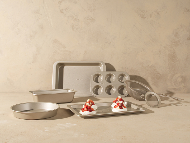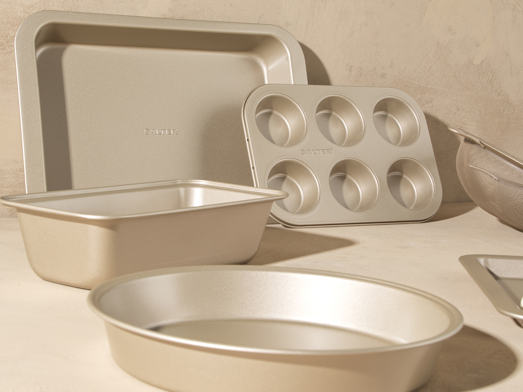 The Salter Bakes 5 Piece Bakeware Set is the perfect addition for any home baker. This set includes a 36 cm roasting pan, 37 cm baking tray, 27 cm loaf tin, 23 cm square pan, and 6-cup muffin tray, all of which feature a modern champagne gold finish. Using this set, you can bake up a storm and impress your dinner guests with a range of delicious creations. With a tough non-stick coating, you can cook with ease without the worry of hard-to-clean messes. Complete with an elegant champagne finish.