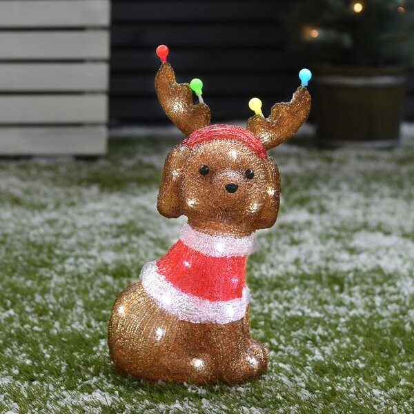 Perfect for dog lovers Novelty Christmas decoration Lights up This LED Acrylic Dog with Antlers is an adorable decoration to place in your garden this Christmas. This festive pooch lights up as he sports his charming little antlers and Santa vest. He's sure to be the envy of all your neighbours this year as they watch this pooch come to life when the sun sets.
