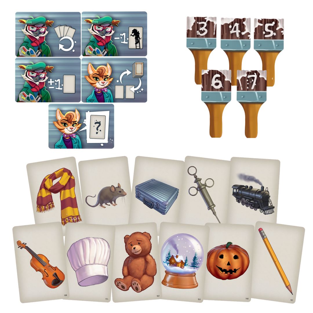 In this cooperative art-themed card game for three to seven players, there are two teams: painters and museum directors. At the start of the game, the museum directors present two cards, each with a picture that represents a visual theme that they have chosen for an upcoming museum exhibition. Next, the painters place some matching picture cards from their hand face down. Four more cards from the art forger Belratti are now secretly added to the deck of cards. The museum directors have to guess which picture cards the painters have submitted for the exhibition and which are forgeries. Will Belratti fool them all? 192 picture cards with many possible visual associations make it a fun challenge to catch the art forger in this family game.