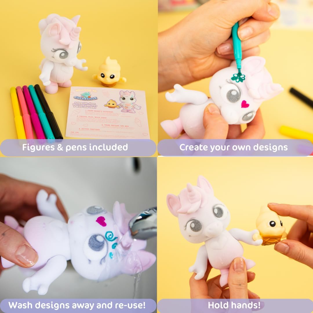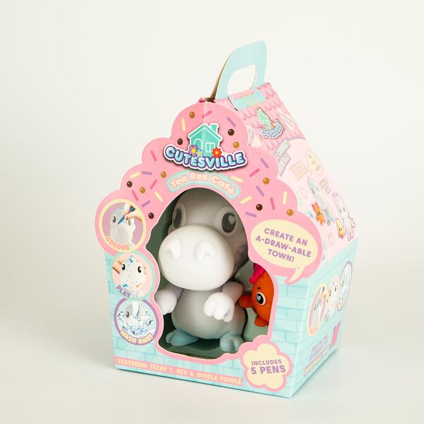 Introducing the all-new Cutesville range of toys from Curious Universe! Create your own a-draw-able town built on fun, creativity, and community with Cutesville! Together with their Little Besties, every Buddy has a part to play in making Cutesville a fun and happy place to live. Every Buddy’s different, so grab your pens and cute-ify any way you want. Meet the first 3 residents of Cutesville; Teeny T. Rex, Sundae the Unicorn and DJ Bop Bear, and their adorable Little Besties; Doodle Poodle, Scoop and Little Big Fish. With a range of three different sized playsets there is a Cutesville Playset for every budget. Each comes with it's own customisable Buddy character and washable pens. Use the 5 washable pens included in this kit to colour and customise your Teeny T-Rex toy to match your own unique style. Then, if you change your mind, simply wash away the design to start again and make a brand new style. Don’t throw anything away! The box your Buddy came in will make a super-cute something to go in your town. Collect cute vehicles, shops, cafés, and other fun places for your Besties to hang out. From salons to schools, huts to trucks, there really is something for every Buddy to enjoy. Buddies hold hands with their Little Besties to create friendship chains. Why not join the different Buddies and Little Besties in the collection together to make a super friendship chain and bring the Cutesville town to life with friendship. Each Mini Kit Includes: 1 large flocked Buddy