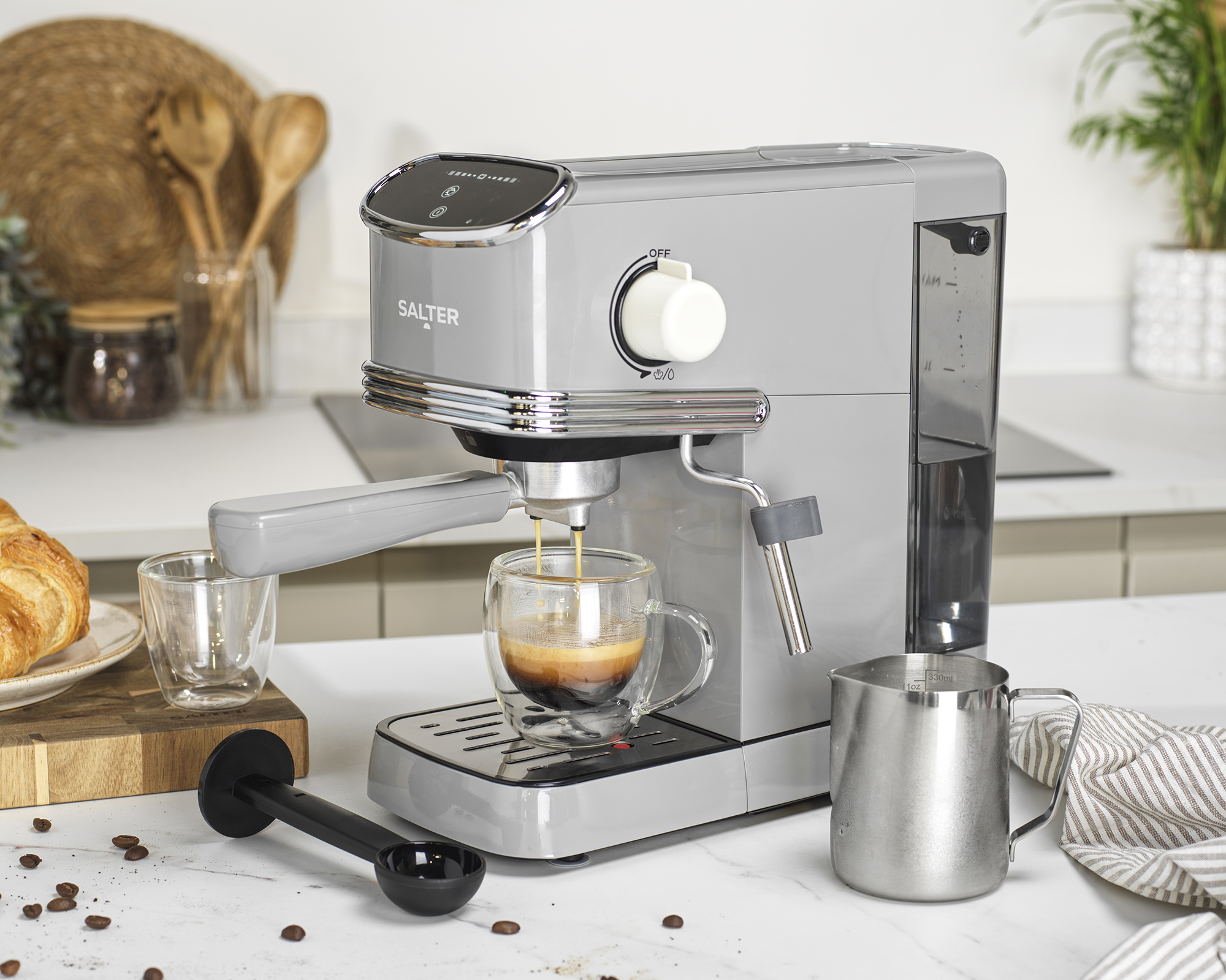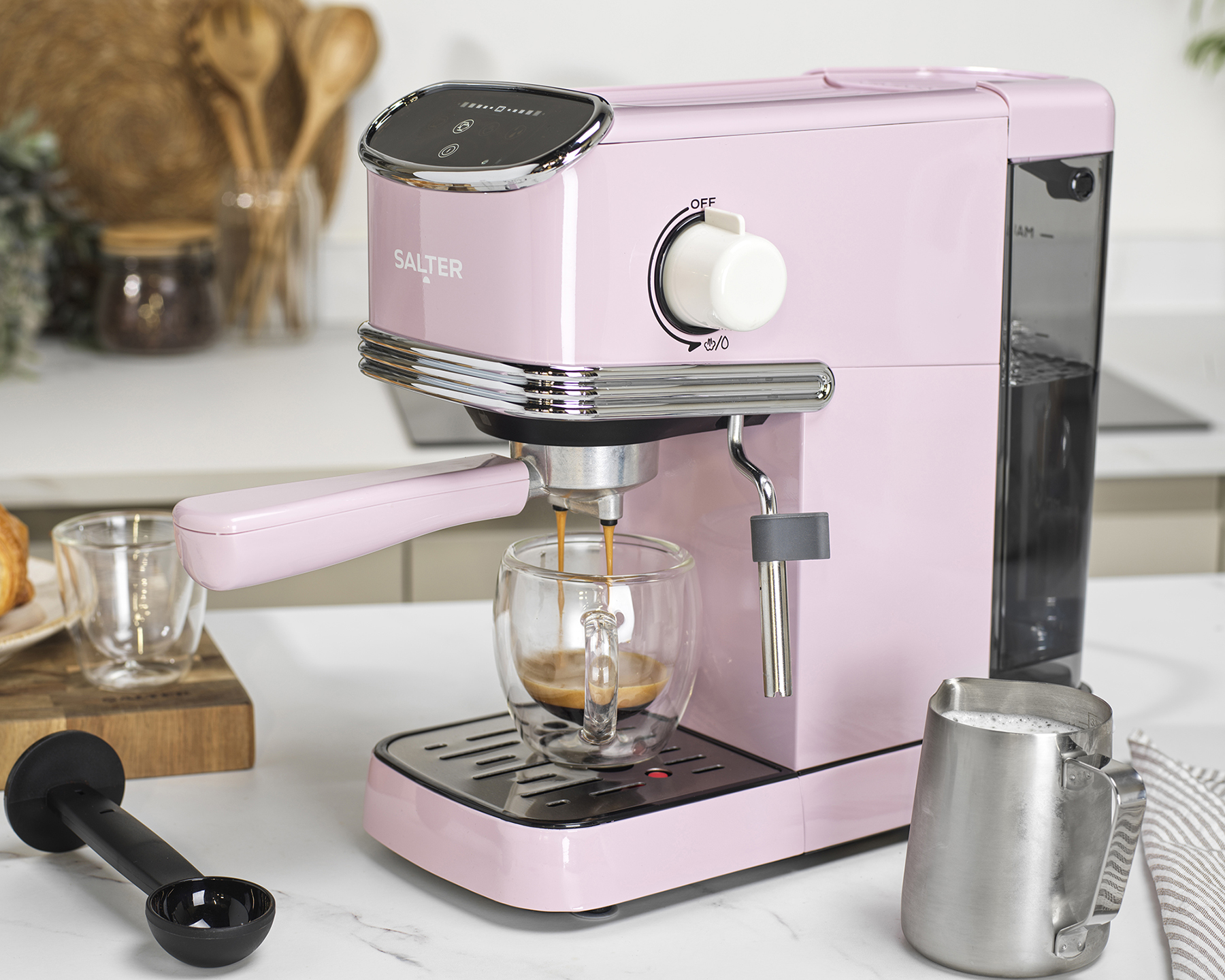 SINGLE OR DOUBLE: Looking to create barista-style drinks from the comfort of your home? This Salter Retro Espresso Machine is compatible with ground coffee and offers a single or double shot function. PROFESSIONAL 20-BAR PUMP: Thanks to the professional 20-bar Italian pressure pump and the 1350W motor, this coffee machine offers powerful extraction and is equipped with a 1.35 litre water tank for less frequent refills. MILK FROTHER: Channel your inner barista using the convenient milk frothing wand, perfect for making creamy or foamy textured milk to create your own unique foam art. DIGITAL LED DISPLAY: Enjoy coffee at the touch of a button! Thanks to the touch-control digital LED display, you can control the power and select from up to 4 various settings. ACCESSORIES INCLUDED: Equipped with a coffee measuring spoon, tamper, portafilter, and a stainless-steel milk jug, this espresso machine includes all the essential accessories to create your favourite hot drinks! Add a chic touch to your kitchen décor with the Salter Retro collection. Offering a variety of Kettle & Toaster Sets, this range boasts a vintage-inspired design in a baby pink or grey colourway.