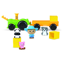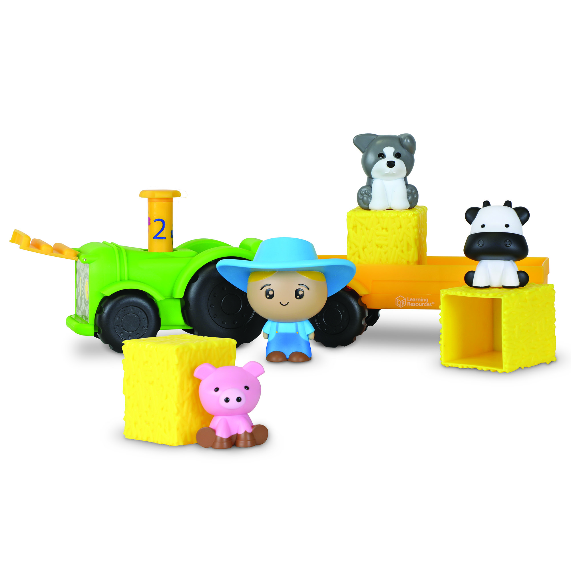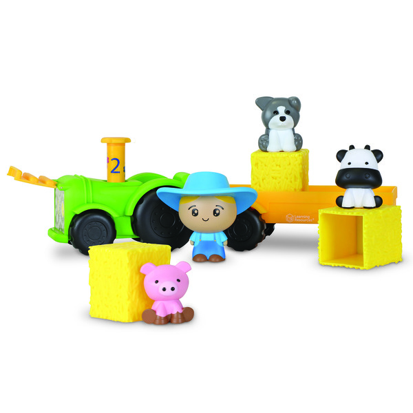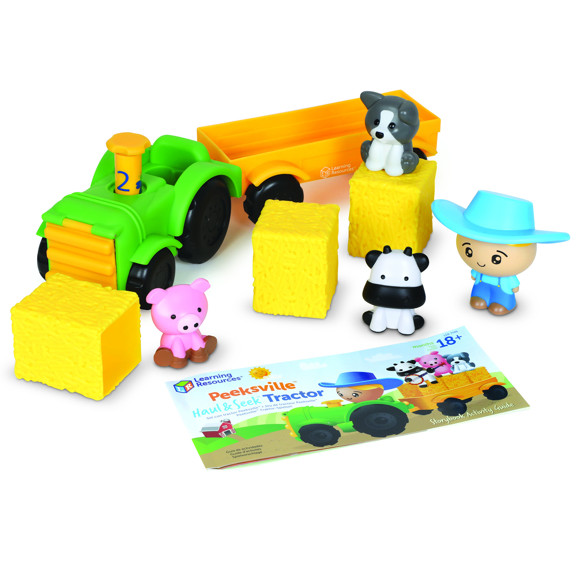 This crew of farmyard friends is ready for a game of hide and seek. Each adorable animal fits under the hay bales for a fun memory game. They’re also ready for pretend play as you pop them on the back of the trailer and pull them along for a ride. The tractor has fun features to keep little hands busy and learning through fidget play – pop the exhaust pipe, lift the grille, turn the wheels and more. Includes tractor with removeable trailer, 4 imaginative play figures, and 3 haybales. The storybook Activity Guide and packaging are multilingual. Tractor measures 16.5 L x 7.5cm H. 10 Piece Set