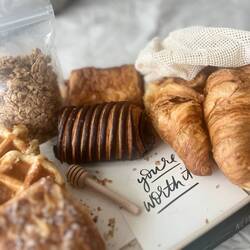 Treat yourself to brunch like a true Parisian with our classic, delicious Parisian style pastries & bakes. Your 'Parisians' Brunch' will include the following: 2 x All butter croissants 2 x Mini sugar waffles 1 x Almond croissant 1 x Hazelnut pain au chocolat or almond chocolate croissant (subject to availability) 1 x Pain au chocolat 1 x French toast granola Freshly Baked Food Packaging: Cardboard, Paper, Recyclable Materials Dimensions Brunch Box Size: W 280 x L 220 x D 110mm