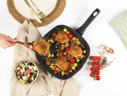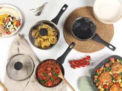 Featuring a unique cooking surface with a high-quality coating, this Salter Megastone 8-piece pan set boasts an improved non-stick performance so that you can prepare healthier meals using little or no oil. Crafted from four layers of PFOA free materials with abrasion, scratch and corrosion resistance as well as an ultra-non-stick topcoat, the pans can be used with metal utensils and is even dishwasher suitable for fast and easy cleaning. With saucepans, frying pans, a griddle, and a wok. From the Salter Megastone Collection, this 8-piece pan set features an ultra-non-stick surface for improved cooking performance. The set includes 16/18/20 cm saucepans with lids, 20/24/28 cm frying pans, a 28 cm grill pan, and a 28 cm wok. With a rugged non-stick coating for improved performance, the pans are suitable for use with metal utensils and are dishwasher safe. They feature a soft touch TPR Bakelite handle and are suitable for all hob types including induction, for all kitchens and abilities. With safety for your family in mind, the frying pan is 100% PFOA free, meaning no harmful chemicals are released during cooking.
