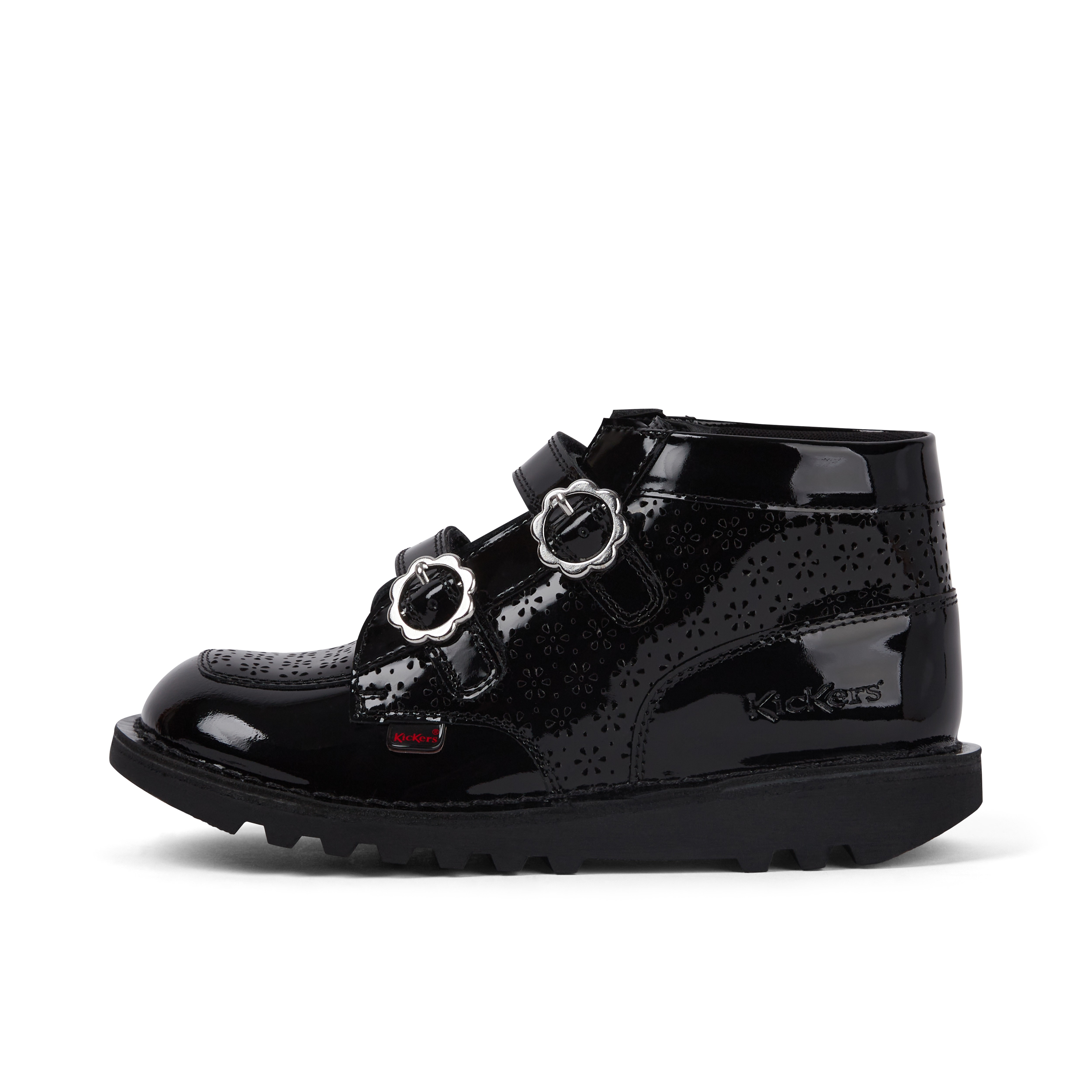 Meet the Kick Hi Meadow – a fresh floral twist on the iconic Kickers silhouette. With delicate flower details, shiny patent leather, and silver blossom-shaped buckles, it’s the perfect mix of playground-ready and polished. Built for comfort, durability, and easy wear, this ankle boot gives little ones style, stability, and the confidence to dress themselves - it's classic Kickers with a blooming upgrade!