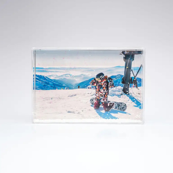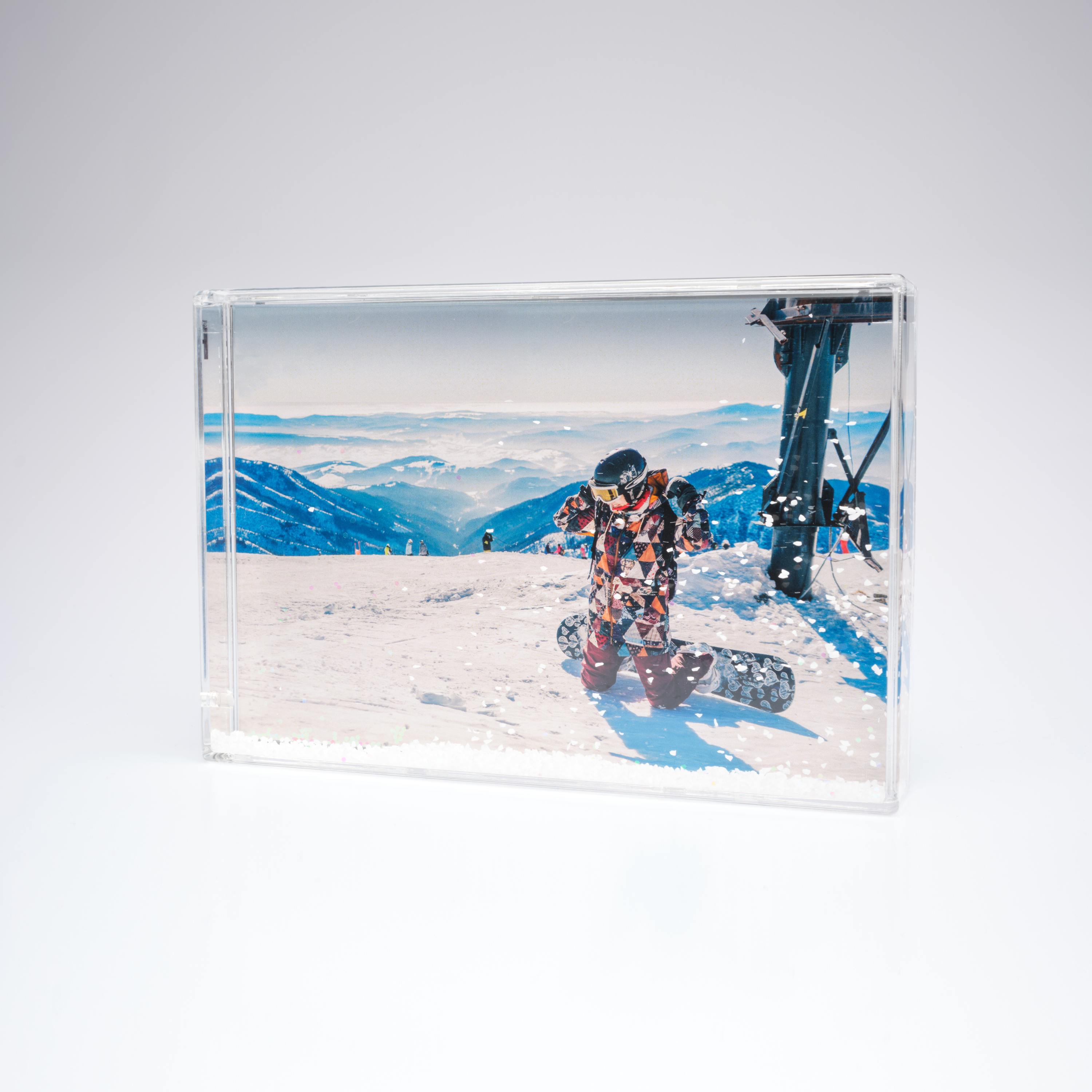 Encase your special memories in an acrylic photo frame filled with snowflakes and glitter for a one-of-a-kind magical effect. Simply shake your snowflake photo block to see the snow fall over your picture — a unique way to experience your favourite moments. Made with safety-certified liquid, you can rest assured that your image will remain protected between the photo block barriers made from polished acrylic. It’s also easy to swap out the image, so you can update it whenever you wish. Ideal as a gift or to brighten up your own home (especially during the holidays), these snow frame photo blocks bring a touch of fun to photo displays. Why not use these delightful photo frames as centrepieces for your winter wedding or pop one in your loved one’s Christmas stocking?