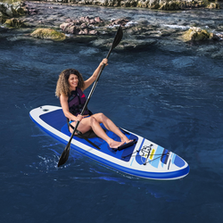 Explore shorelines, rivers and even catch waves with the Hydro-Force™ Oceana Tech Stand Up Paddle Board (SUP). At 3.05 Meters/10ft this board has been designed to offer optimum strength, stability and control for when you are out on the water. 12cm thick and made from renowned TriTech™ material and coupled with the extremely rigid Drop Stitch™ Material, this board can comfortably support a rider of up to 120kg. A great all-rounder this SUP has a shape which ensures great stability and speed in every water condition. Supplied with the ultra-lightweight adjustable 4 piece aluminium paddle, you can set it up to suite your paddling style. Setting up the Ocean Tech is easy, simply inflate the SUP with the included hand pump and you can be out on the water in a matter of moments. Supplied with a seat and footrest, you can paddle whilst sitting down. However if you do want to stand up, the non-slip traction pad ensures you keep your balance. With one streamline fin, the Oceana Tech SUP provides you with total directional stability and manoeuvrability when out on the water. The Oceana Tech even comes with a deluxe travel bag, a surf leash and one repair kit so you can transport and maintain your board with ease