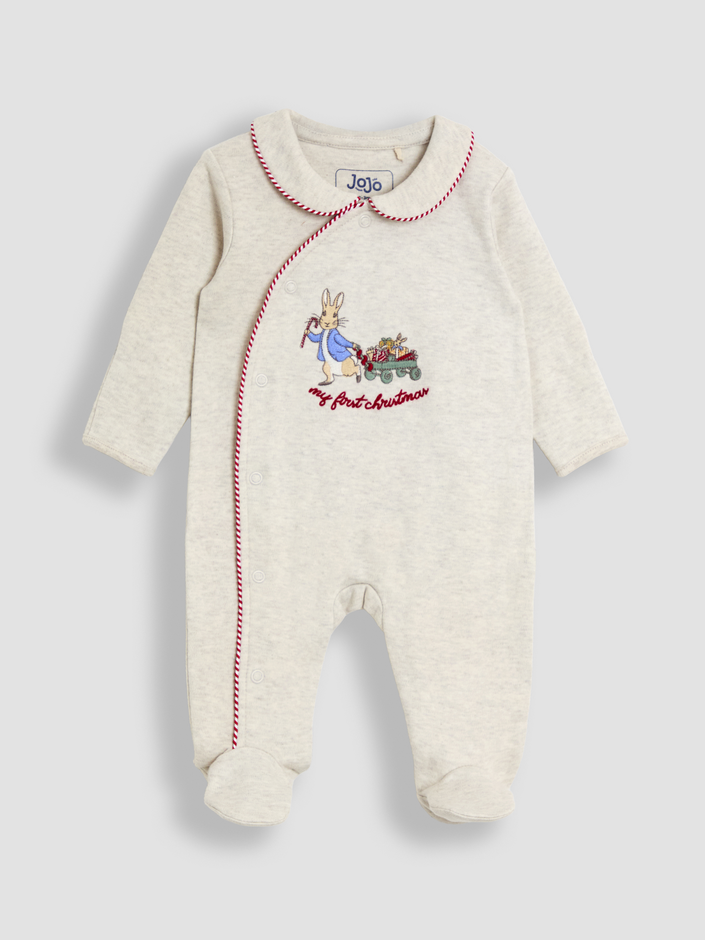 Someone s hopped in to wish your new bundle a very hoppy first Christmas! This Peter Rabbitâ„¢ My First Christmas Footed Sleepsuit will make the most special Christmas gift for little ones. The sweet Peter Pan collar and the charming applique adds a delicate, festive touch and the handy popper opening makes changing super easy while retaining JoJo s usual quality and soft touch cotton, and the foot pockets will keep toes nice and toasty.