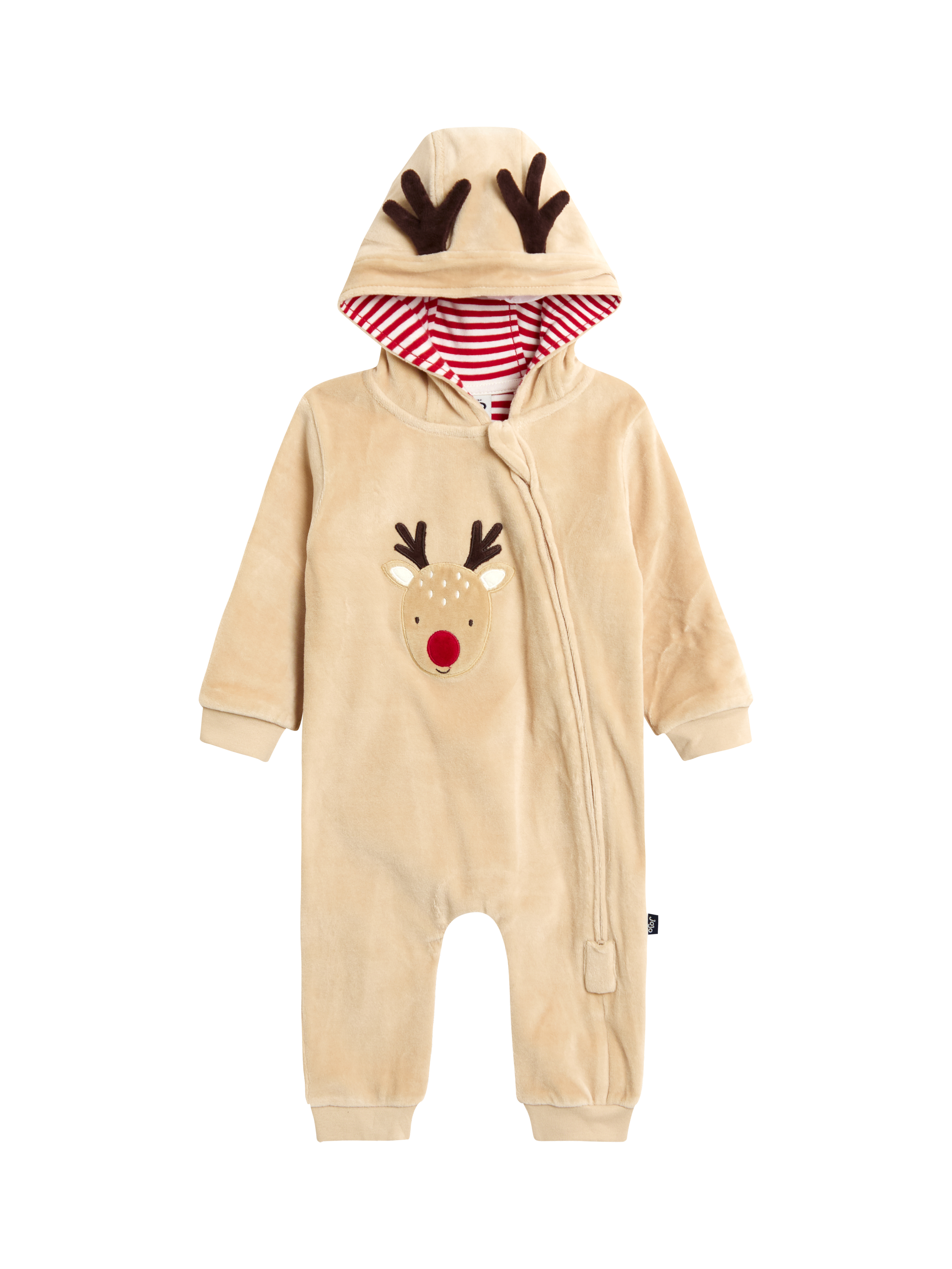 Ho Ho Ho! Santa's added a tiny new reindeer recruit this year. Enjoy festive sleigh rides and snuggly nights with this Christmas Velour Hooded All-in-One. Crafted from top to toe in supersoft fabrics with a handy zip-up fastening for easy changing, this all-in-one is perfect for keeping little bundles snug whilst out and about, so everything is comfy and cosy! And the oh-so adorable hood with 3D antlers pairs perfectly with the reindeer appliqué sitting across the front, so little ones will be looking cuddly, Christmassy and cute all season long.