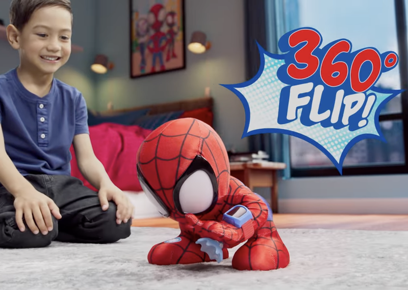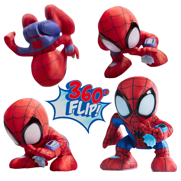 Flip into action with the deluxe 12-inch Amazing Flip Spidey! This animatronic plush performs an incredible 360° flip, features 50+ sounds and phrases across 10 missions, and includes lights, a commlink, web dart launcher, and soft fabric finish.