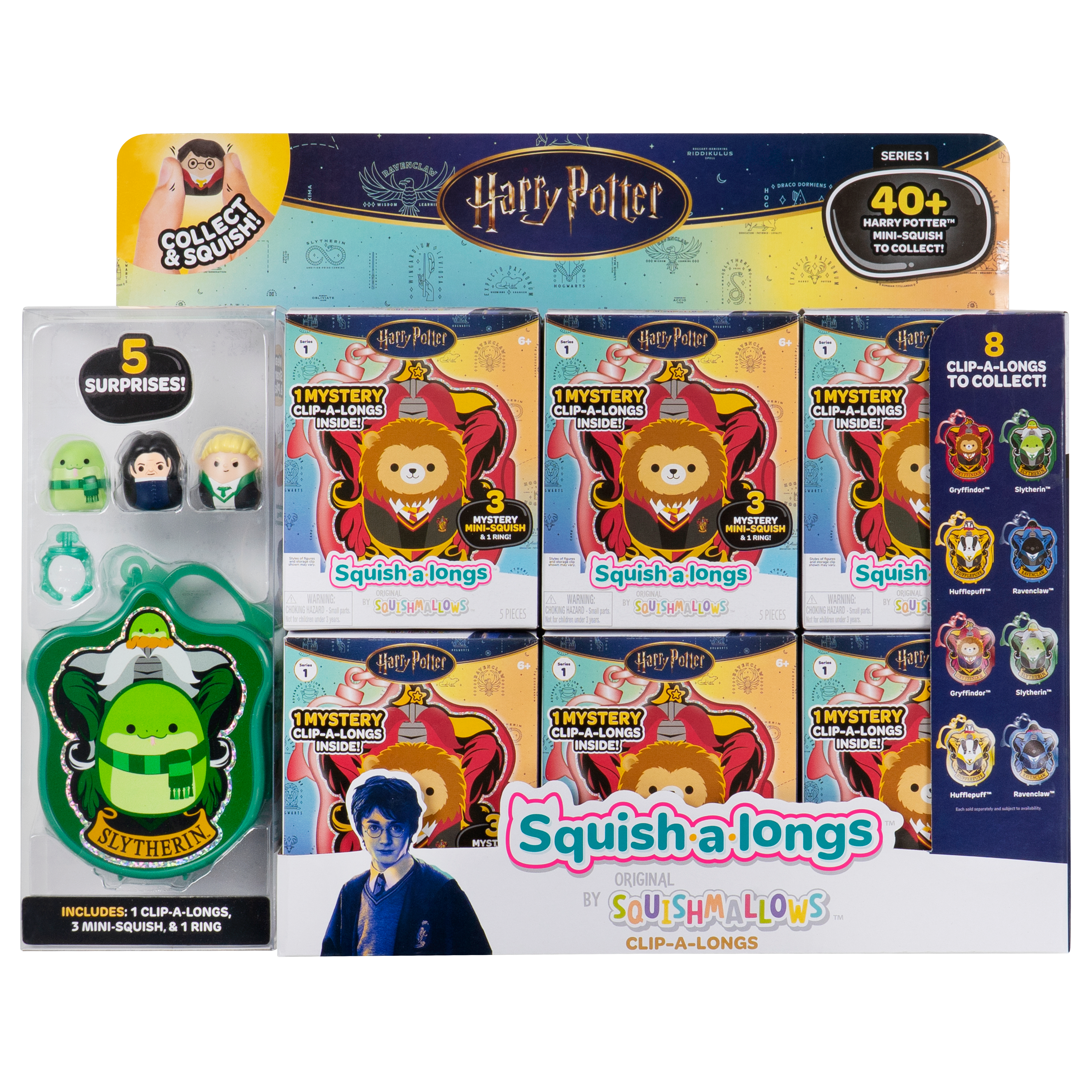 Cast a spell on your Squad with “Harry Potter” Squish-a-longs! Each Mystery Pack includes (3) 1-inch Mini-Squish figures and (1) Clip-a-longs carrying case themed to a Hogwarts House style: Gryffindor, Metallic Gryffindor, Slytherin, Metallic Slytherin, Ravenclaw, Metallic Ravenclaw, Hufflepuff, or Metallic Hufflepuff. Store your Mini-Squish in the case or attach them to the included ring for on-the-go fun. Official Squishmallows product, licensed by Warner Bros. Discovery.