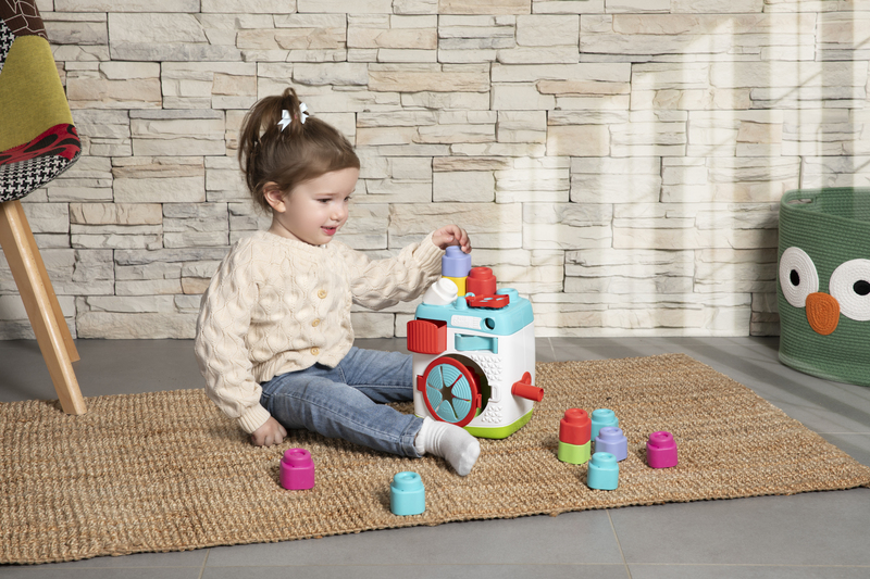 Inspires imaginative, sensory play. Toddlers can insert Soft Clemmy blocks through the flexible opening, spin the drum, and explore tactile features like a pop-it and switch. The set includes stackable, soft blocks and realistic elements like a detergent drawer and door—perfect for curious little hands to explore.