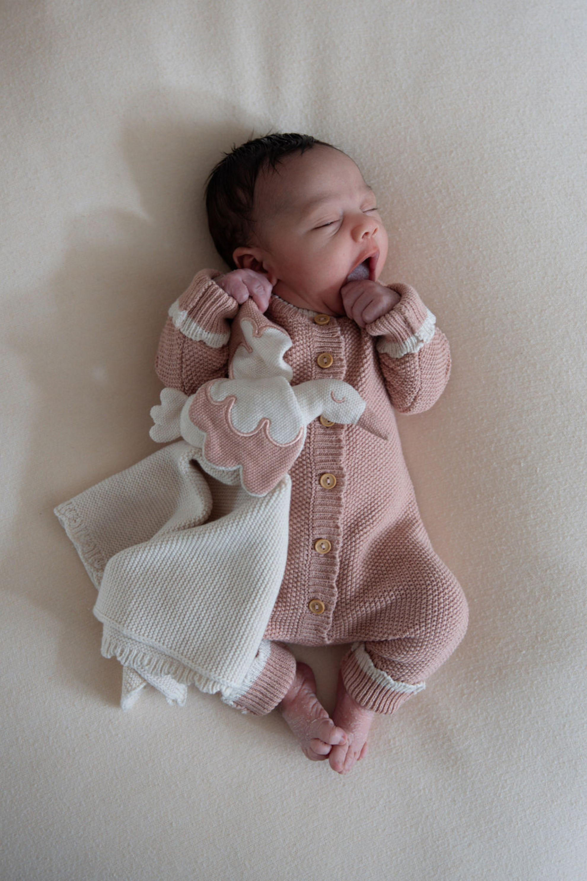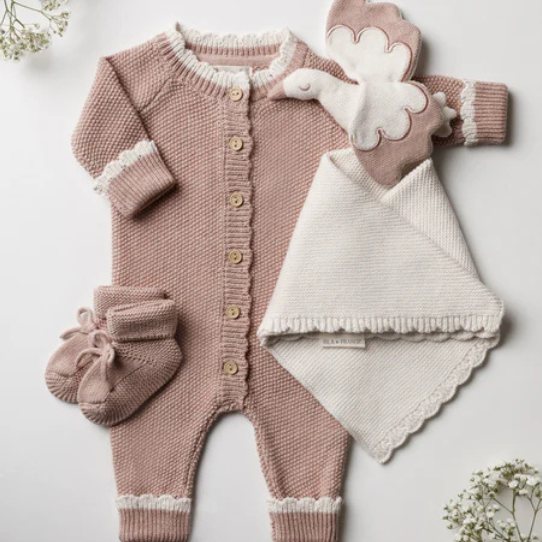 Our Luxury Baby Stork Bundle contains a carefully curated collection of our award-winning rose melange baby knits. This exclusive gift bundle includes our award-winning Moss Stitch Baby Romper, adorable Baby Booties, and signature Oat and Rose Stork Comforter. Beautifully presented as a gift set, this exceptionally soft new baby bundle is the ultimate choice for a luxurious newborn gift. Our Luxury Baby Stork Bundle won Gold for 'Best Baby Gift Box' in the 2025 Project Baby Awards.