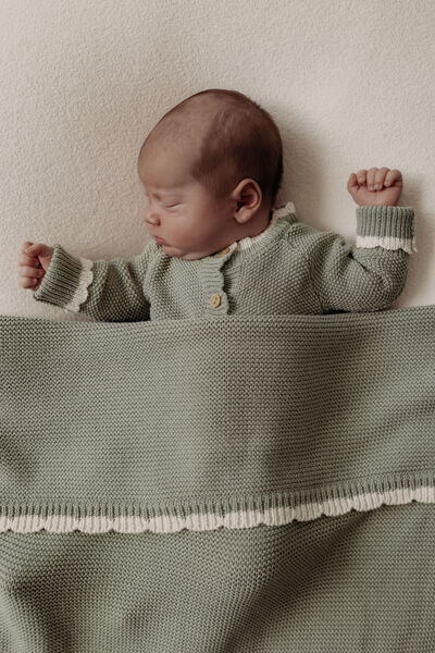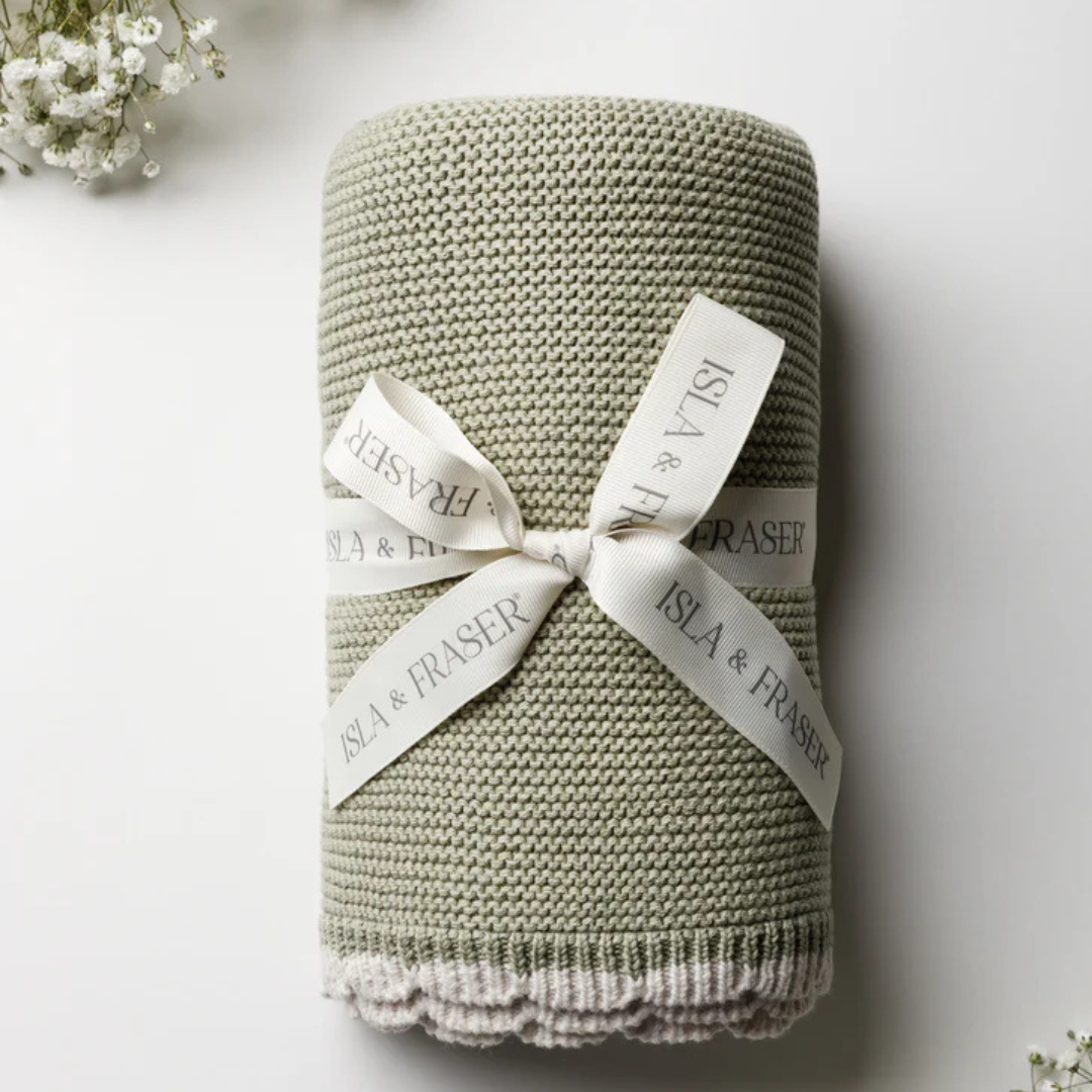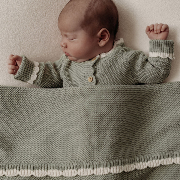 Cocoon your little one in comfort with our Sage Scallop Tipped Baby Blanket. Our soft sage garter stitch is a beautiful blend of simplicity and sophistication. Crafted with our signature scallop trim, tipped with a complimentary light oat border, this blanket is the ultimate newborn gift. Knitted in GOTS-certified organic cotton, this blanket is not only exceptionally soft and gentle on delicate newborn skin but is also breathable and thermoregulating, ensuring optimal comfort in any season. Our Blankets have earned 15 industry awards, including the prestigious Platinum for 'Best Baby Blanket' in both The Organic Baby Awards 2025 & The Essential Baby Awards 2025. These accolades attest to the quality and craftsmanship that define our products.