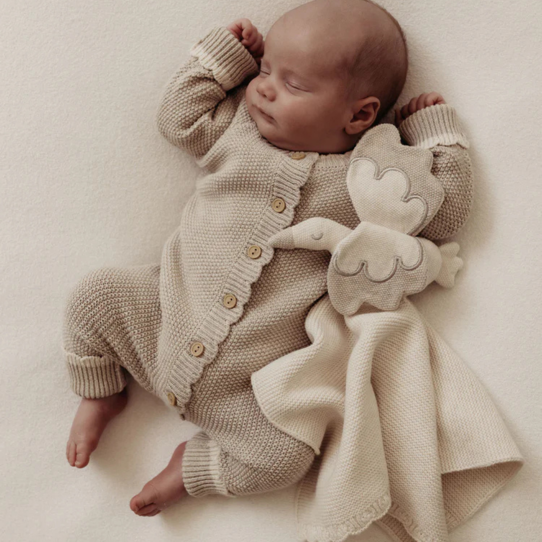Crafted with the utmost care, this luxury baby gift was hand-sketched based on our iconic Isla and Fraser logo, and is knitted in our exceptionally soft organic cotton. Our stork comforters feature our signature oat melange scalloped blanket detail combined with pebble grey scalloped wing detail. Pebble embroidery is used for our sleepy eye detail and to accentuate the beautiful scalloping on the wings. Our Isla & Fraser Stork makes a thoughtful new baby gift and is destined to become your little one's cherished companion.