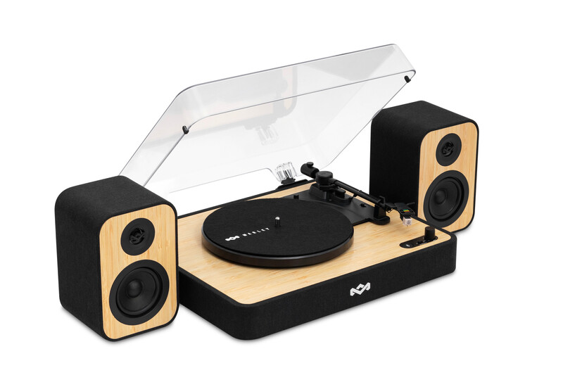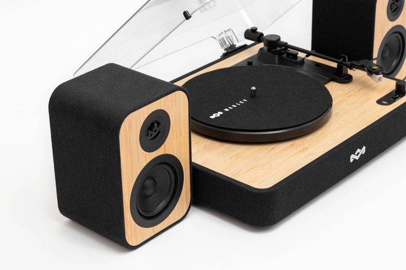 Discover the Revolution Turntable and Speakers sound system. With an Audio-Technica stylus, sleek dust cover, felt mat, pre-calibrated tracking force, and anti-skate, this Bluetooth® turntable is simple to use and enjoy. It has a built-in dust cover for minimal maintenance and two bookshelf speakers. Made with sustainable materials like bamboo, REWIND™ fabric, and post-consumer plastics, this setup offers the highest-quality sound and aesthetic.