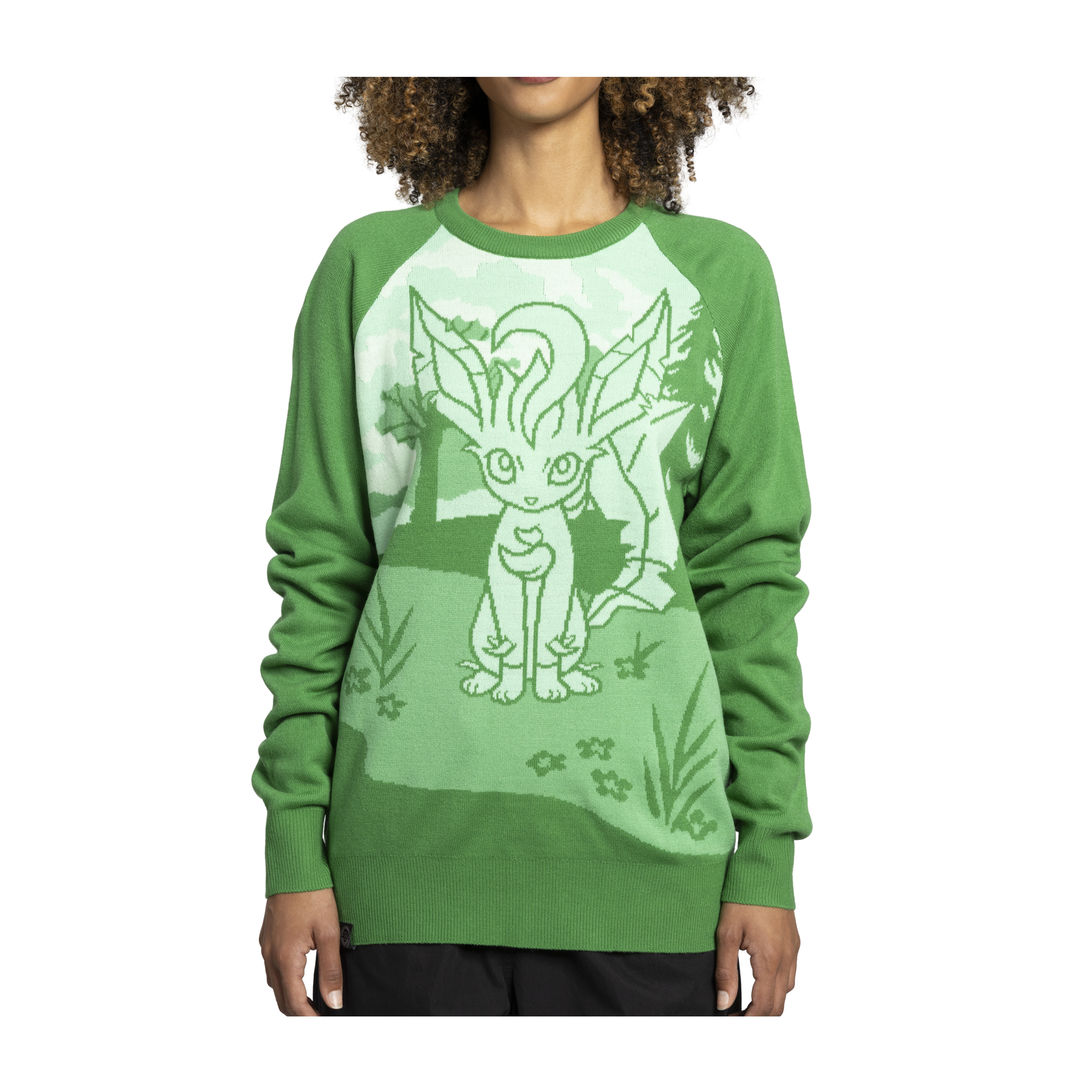 Battle winter breezes and blizzards in comfort with the help of a Pokémon friend! Leafeon poses prettily on the front and slumbers peacefully on the back of this picture-perfect crew neck sweater that's great for holiday parties, gift shopping, or just lounging at home.