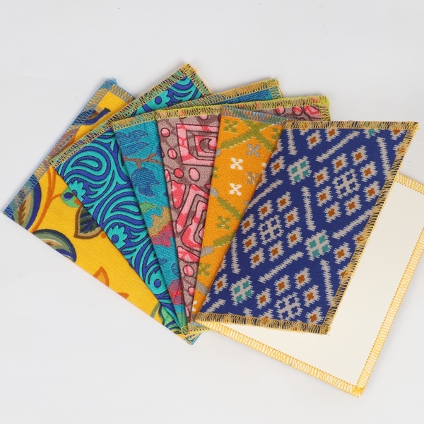 Beautifully unique cards made from colourful recycled sari fabric handmade in India. Pack of six cards to gift to a loved one. The cards are blank inside for you to write your own personal message. Perfect for any occasion. Dimensions: 130 mm x 200 mm Blank inside Handmade in India
