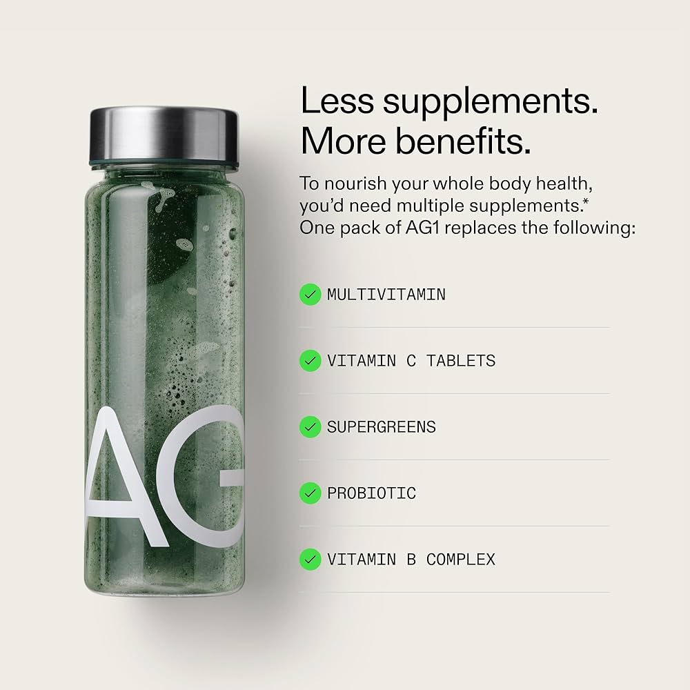 AG1 is designed to support daily nutrition and help you feel your best. Each scoop combines 70+ high-quality ingredients – vitamins, minerals, botanicals and bacterial cultures – selected for potency, absorption, and nutrient synergy.