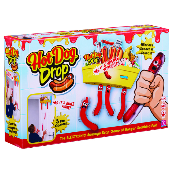 Get ready for loads of fun grabbing each sausage as they drop from the sizzling grill with this Hot Dog Drop Game. As the hot dogs, franks and bangers fall, players must grab as many as they can in the time allowed without dropping any to secure the points and win the rounds! Choose from 3 different game settings - 'Battle of the Bangers' (Easy and Hard modes) and 'Frankfurter Frenzy' where players must follow the falling pattern of the sausages very tricky! Featuring crazy speech and sound effects, Hot Dog Drop is the frantic, fun game the whole family can enjoy, young and old! Time to grab those buns and get sizzling!"