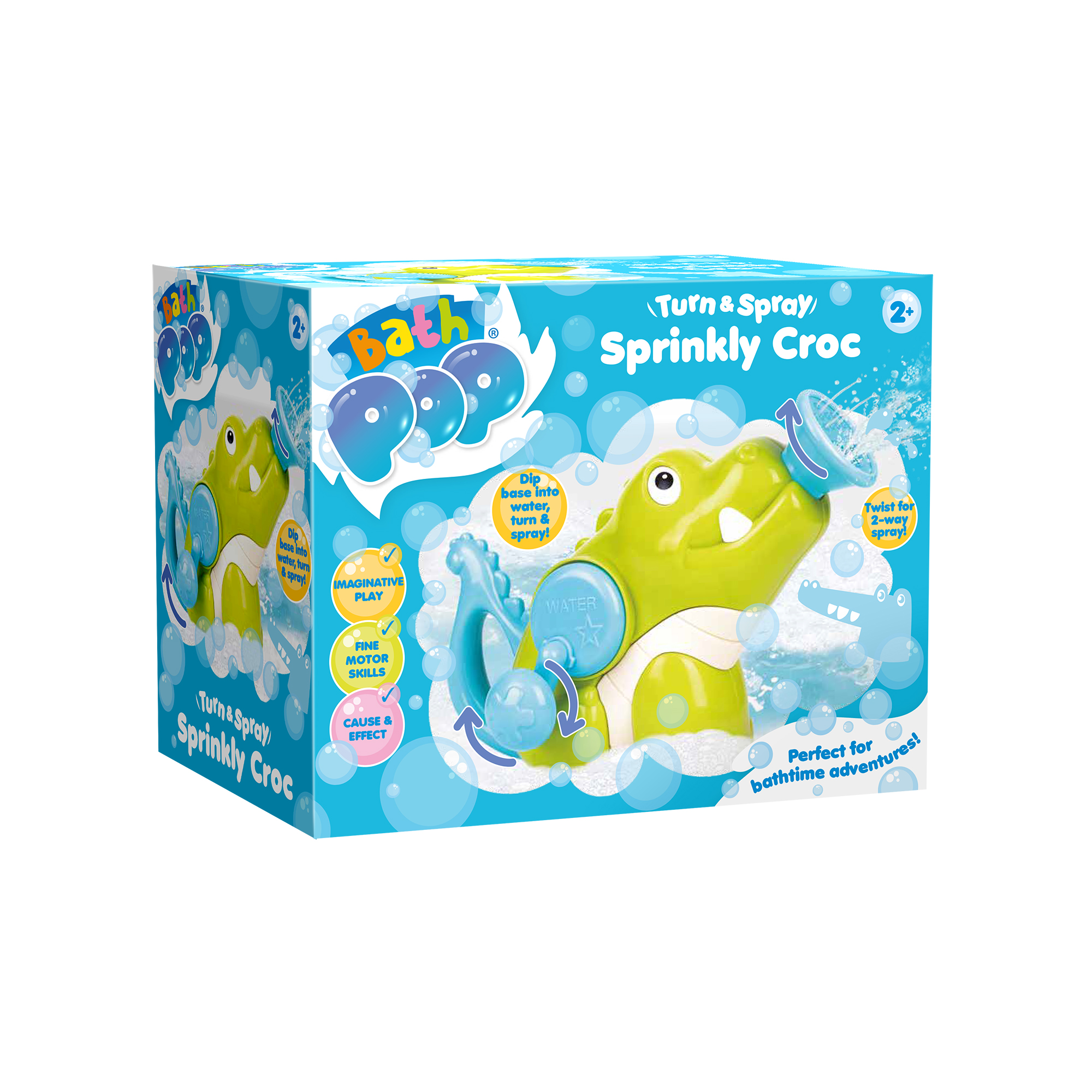 Turn up your bathtime fun! Dip the base of Sprinkly Croc into the bath and turn the easy-hold handle to draw water in, then watch it spray straight out of his mouth! Twist Sprinkly’s mouth to discover different water effects, and keep turning to spray again and again. Sprinkly loves it and so will you!