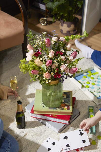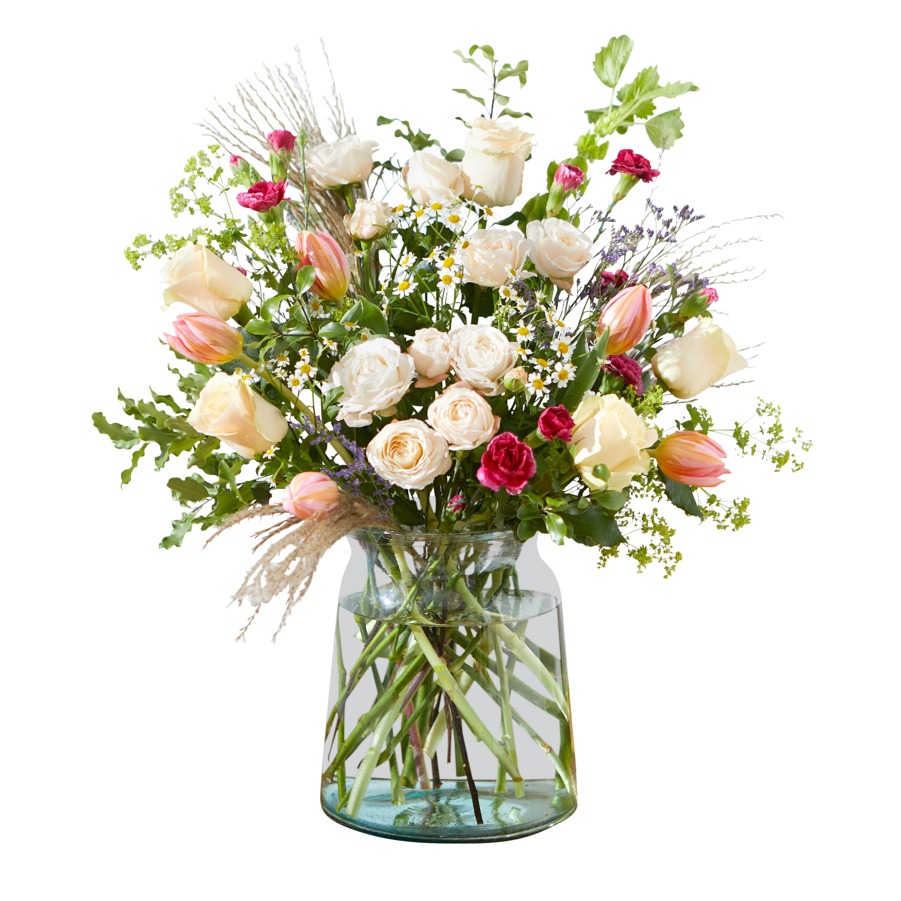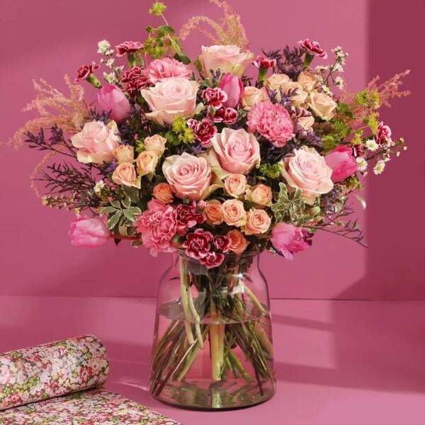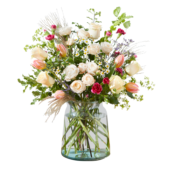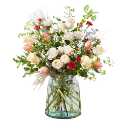 This impressive bunch with roses, tulips and aster is a lovely way to say thanks to someone special. 35 stems including roses, tulips, mini pitto, carnations, asters and bupleurum.
