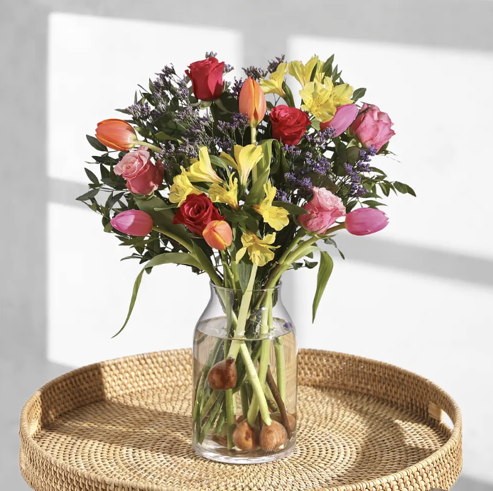 18 stems including roses, tulips, pistache and limonium. These tulips are grown in the UK, and we send with bulbs attached for added freshness. The best bit? The bulbs can be stored, replanted and enjoyed next spring.